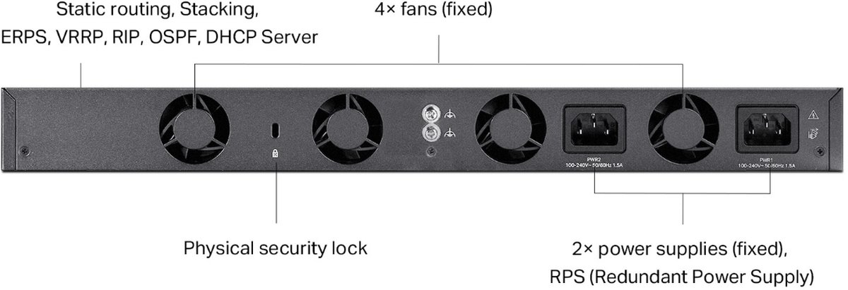 - Изключително наличен с две вътрешни фиксирани захранвания , VRRP и ERPS