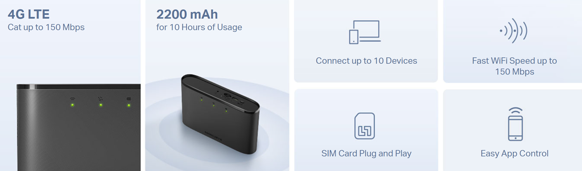 Това е автоматичен превод. Оригиналния текст може да видите тукMT110 е 4G рутер, идеален за пътуване благодарение на компактния си размер и вградената батерия от 2200 mAh. След поставяне на SIM карта, той създава точка за достъп със скорост на сваляне от 150 Mbps и скорост на качване от 50 Mbps за до 10 потребители и издържа до 10 часа с едно зареждане. Устройството може лесно да се управлява чрез приложението Mercusys.