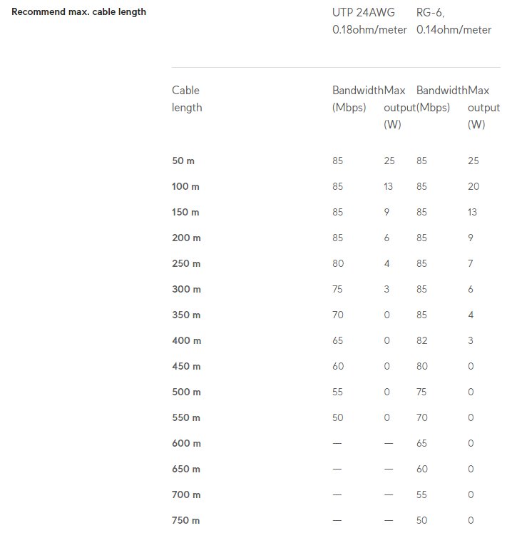 Това е автоматичен превод. Оригиналния текст може да видите тукДвойка удължители, които ви позволяват да удължите PoE през усукана двойка или коаксиален кабел. Това решение е идеално за ситуации, в които подмяната на оригиналното окабеляване не е опция. Всеки удължител разполага с 1x 10/100 Mbit ETH порт и двупинов конектор, който може да бъде снабден с клемен блок или коаксиален адаптер. Захранването на удължителите се осъществява чрез PoE-IN порта с PoE++ (50V DC, 1.2A), докато от другата страна получавате PoE-OUT PoE+ изход (48V DC, 0.6A). Предаването по усукана двойка или коаксиален кабел е базирано на стандарта Homeplug AV . Самите удължители консумират 3W мощност.