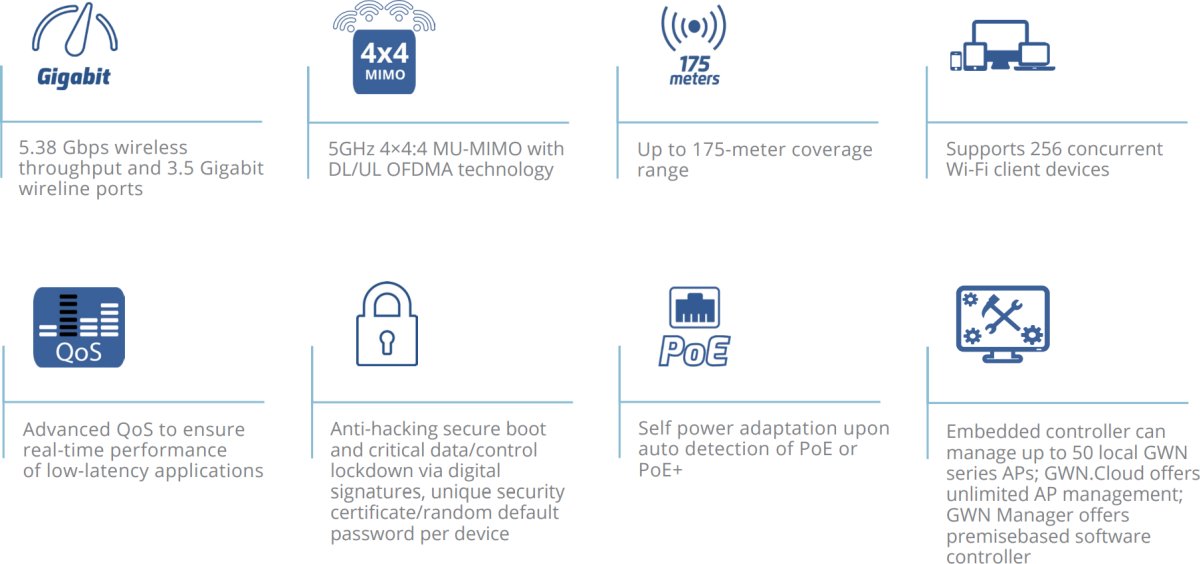 - Вграденият контролер може да управлява до 50 локални точки за достъп от серията GWN; GDMS Networking предлага неограничено управление на точки за достъп; GWN Manager предлага софтуерен контролер, базиран на място