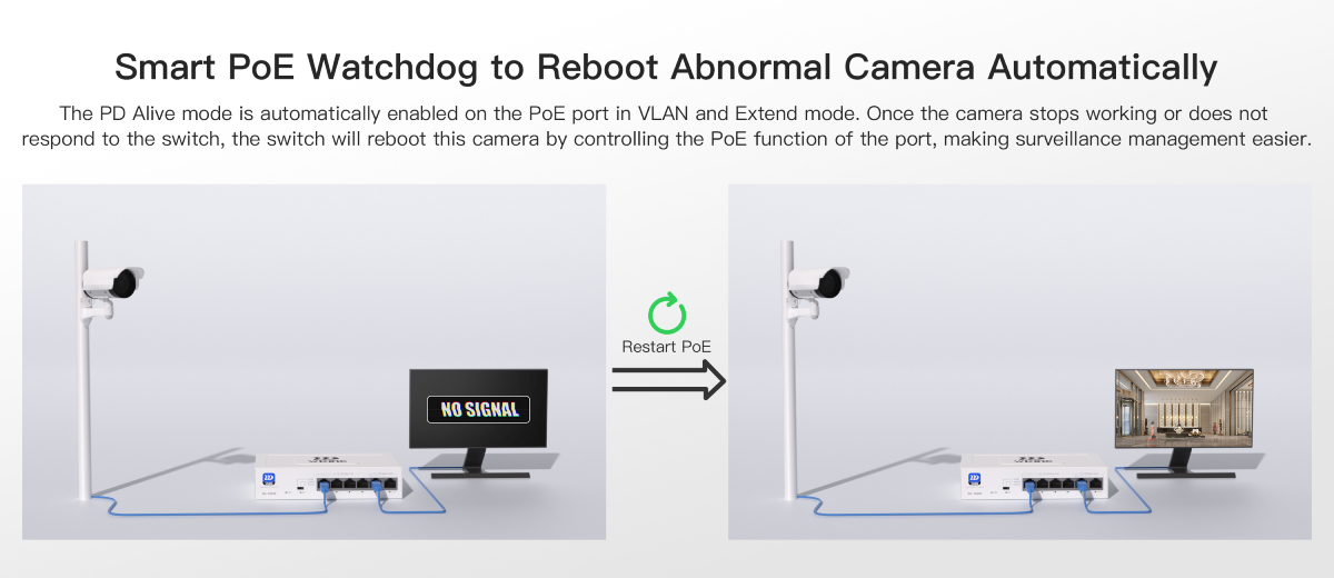 Функцията PD Alive автоматично разпознава дали свързано устройство (напр. IP камера) реагира. Ако не, комутаторът ще изключи и рестартира порта. Това осигурява непрекъсната работа на системата за наблюдение без необходимост от ръчна намеса.