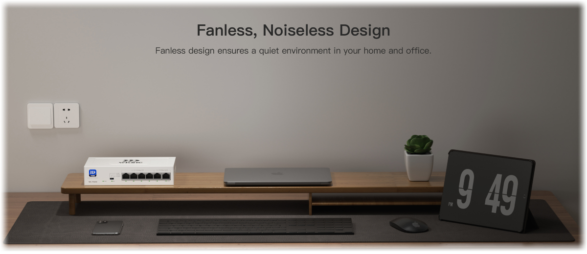 Благодарение на пасивното си охлаждане без вентилатор, комутаторът работи напълно безшумно. Той е идеален не само за шкафове, но и за поставяне на офис бюра, рецепции или в малки фирми.