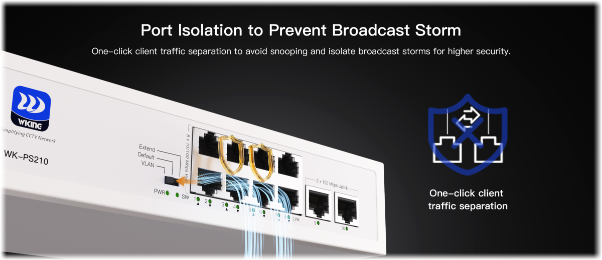 В режим VLAN, отделните PoE портове са изолирани и могат да комуникират само с uplink портовете. Това предотвратява ненужния broadcast трафик между устройствата, предпазвайки мрежата от претоварване от така наречените „broadcast storms“ и повишавайки цялостната надеждност и сигурност на предаването.