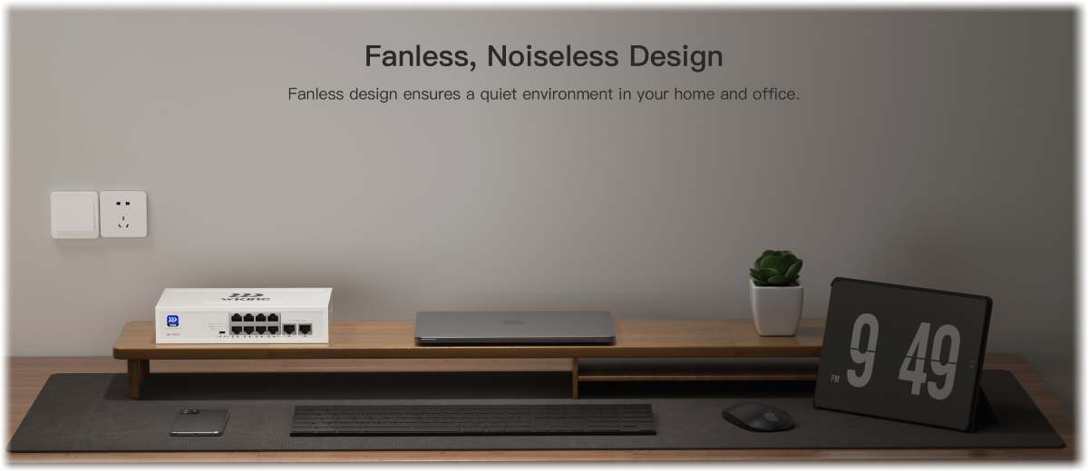Благодарение на пасивното охлаждане без вентилатор, комутаторът работи напълно безшумно. Подходящ е не само за мрежови шкафове, но и за поставяне директно върху бюра в офиси, рецепции или малки фирми.