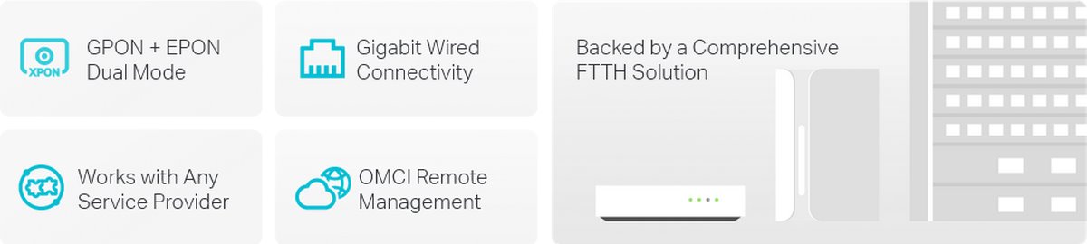 - Гигабитов интернет достъп: Един PON порт и един гигабитов LAN порт осигуряват бързи скорости на трансфер.
