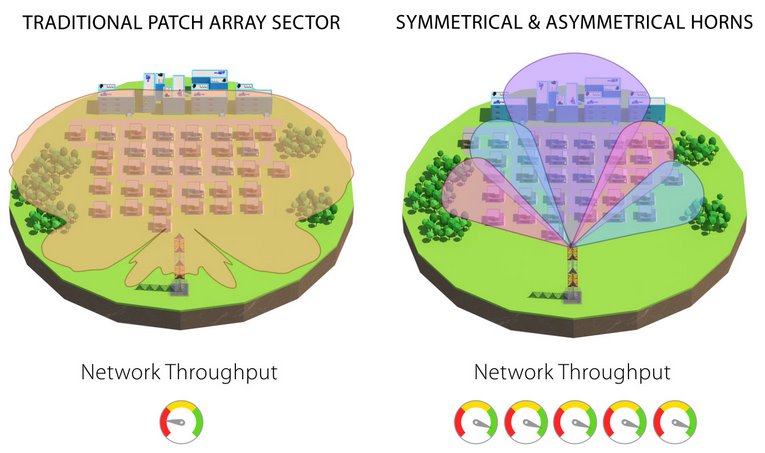 Основните секторни антени с пач решетка имат изключително широка диаграма на излъчване по азимут и изключително плоска в равнината на елевацията. Ако точка за достъп (AP) е разположена на висока кула, клиентите в близост до кулата страдат от ниско ниво на сигнала на AP. Асиметричните рупорни TP антени осигуряват ценни допълнителни градуси в ширината на лъча по елевацията, свивайки нулевата зона, като същевременно запазват увеличеното усилване за работа на дълги разстояния.