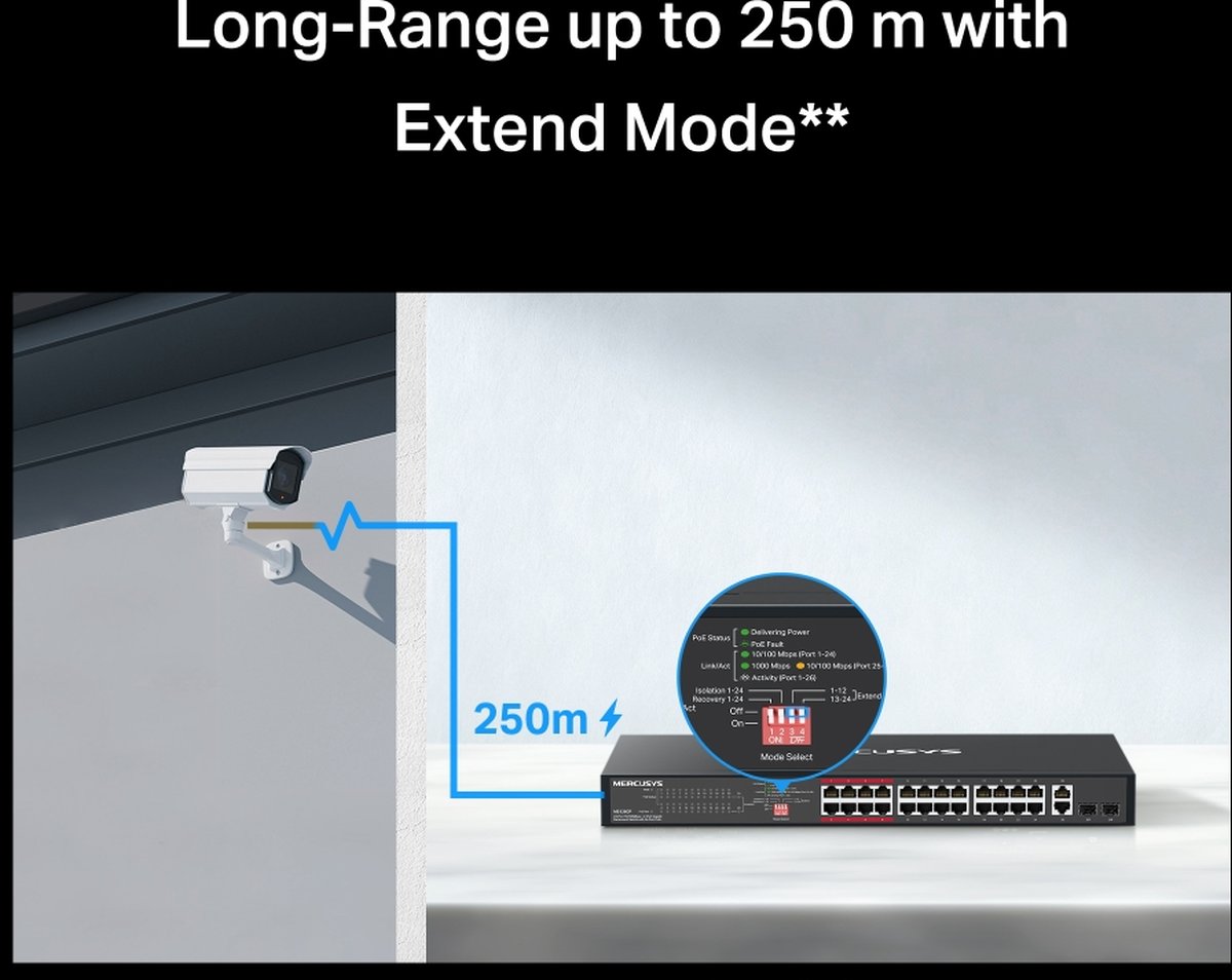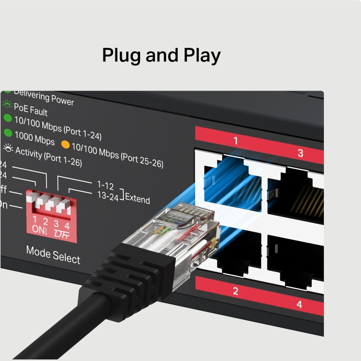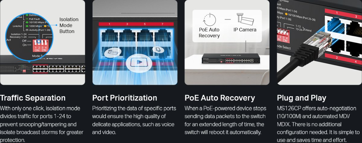 Това е автоматичен превод. Оригиналния текст може да видите тукThe MS126CP is a 26-port rackmount switch with 24x 10/100M PoE+ ports, ideal for small and medium business IP surveillance with a 295 W PoE budget. The plug-and-play design makes it easy for deployment without the need for a technician.
