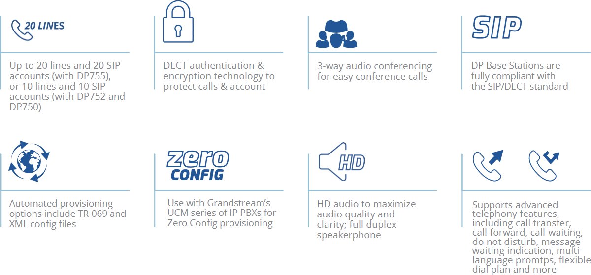 - Поддържа се от DECT базовите станции на Grandstream