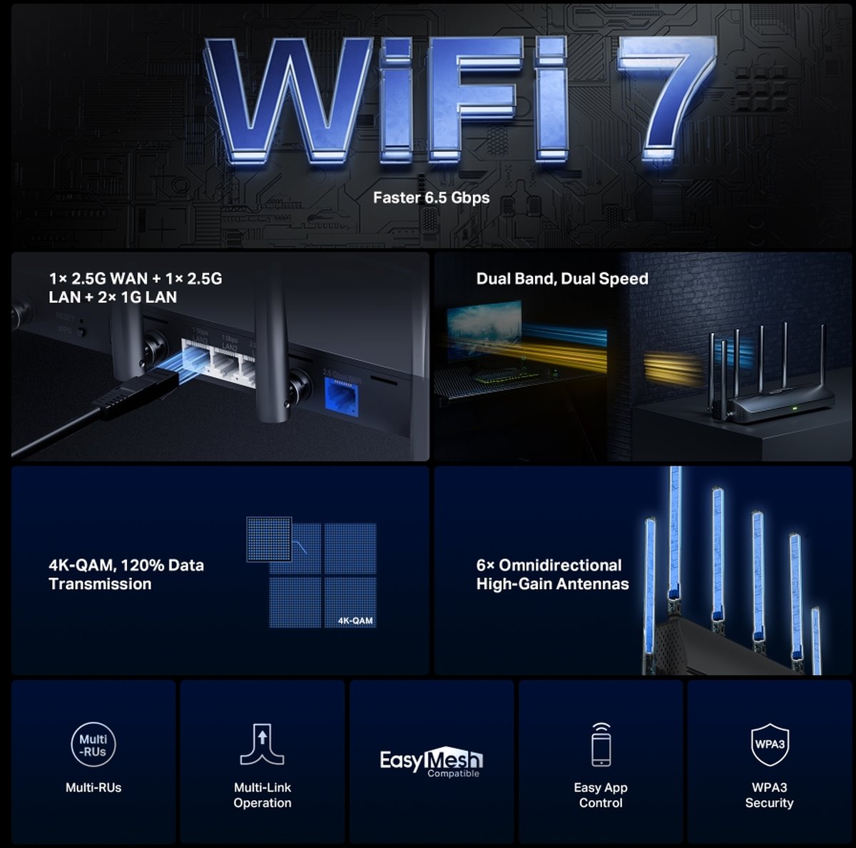 - Двубандов рутер - до 6,5 Gb/s: Насладете се на плавен 4K/8K стрийминг, максимални онлайн игри и светкавично бързо изтегляне.