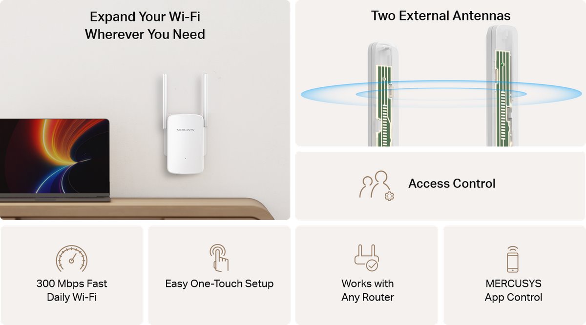 - 300 Mbps дневен Wi-Fi — Насладете се на бърз и стабилен разширен Wi-Fi навсякъде със скорост до 300 Mbps, отговарящ на нуждите на вашето ежедневие.
