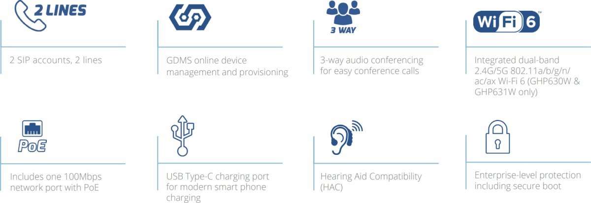 Това е автоматичен превод. Оригиналния текст може да видите тукGHP630(W) и GHP631(W) включват HD високоговорител на слушалката, 2 SIP акаунта/линии, 10 клавиша за бързо набиране и 6 контекстно-чувствителни софтуерни клавиша, както и 2 модела с вградена двубандова Wi-Fi 6 поддръжка (GHP630W и GHP631W).