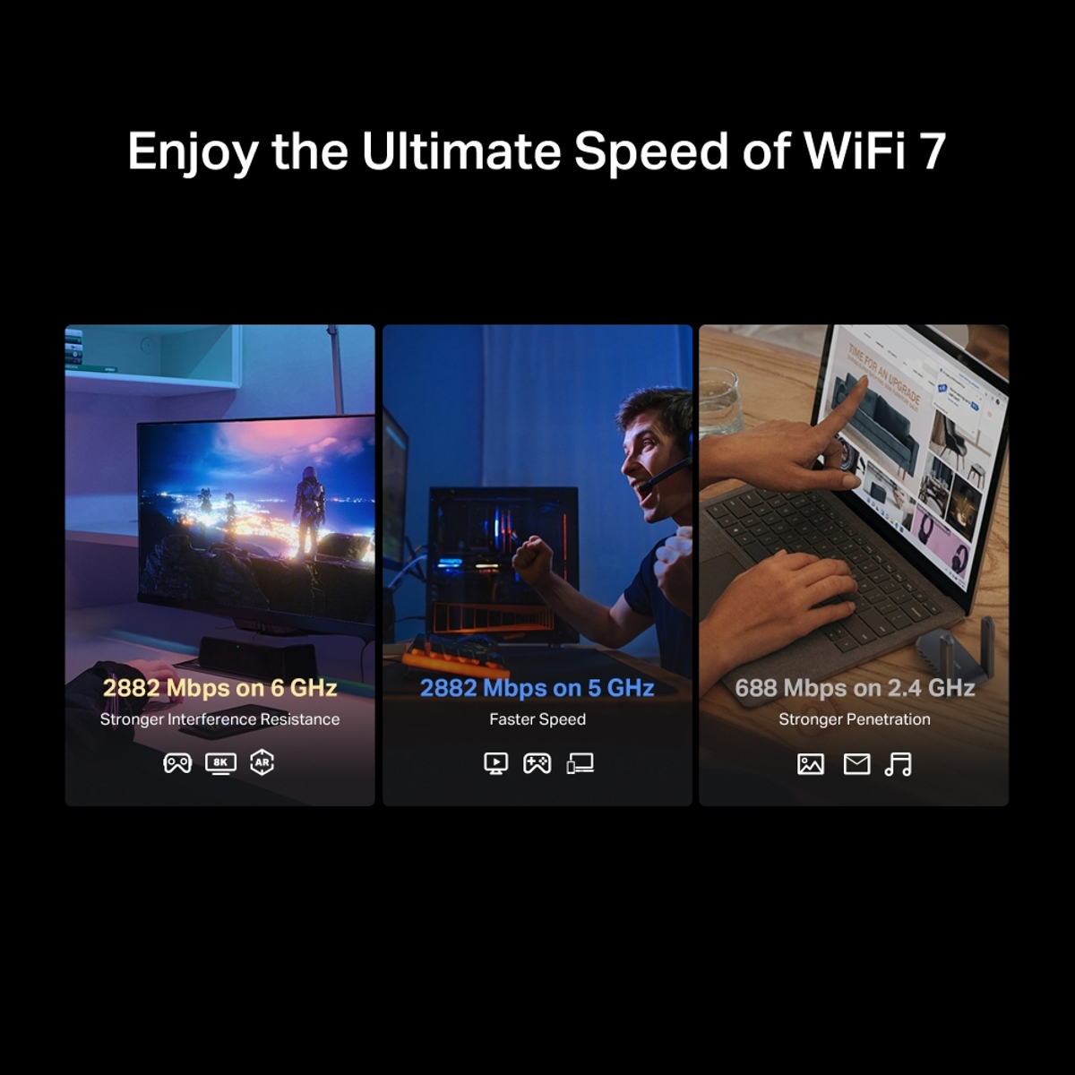 • Трибандова Wi-Fi скорост – Скорости до 2882 Mbps (6 GHz) + до 2882 Mbps (5 GHz) и до 668 Mbps (2.4 GHz).
