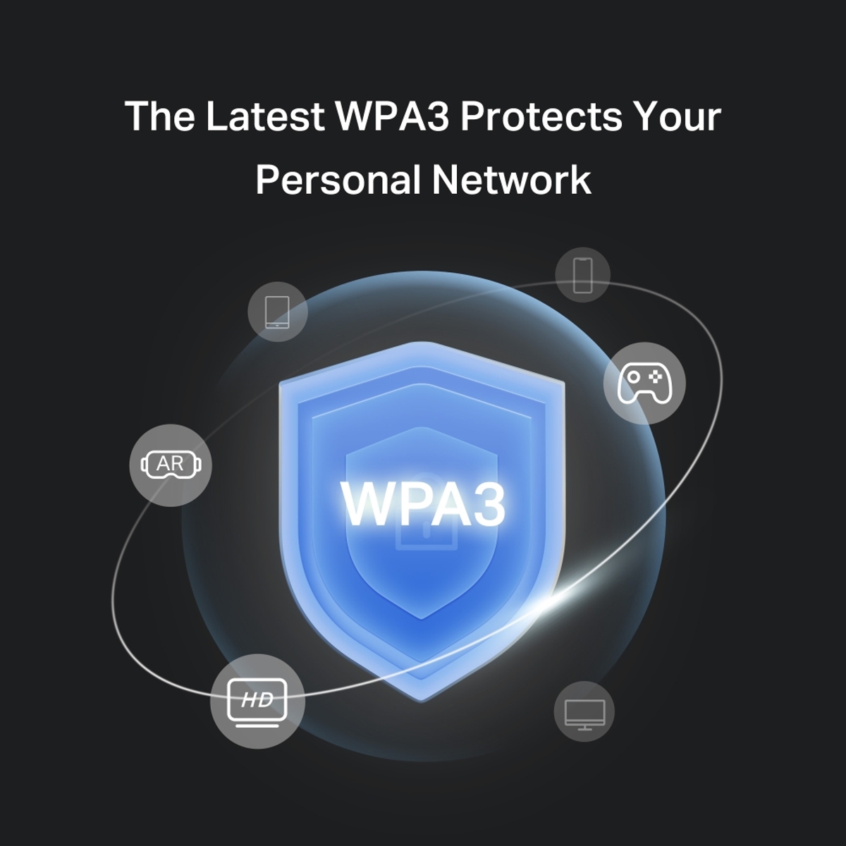 • Подобрена сигурност — WPA3, най-новият стандарт за сигурност, осигурява подобрена WiFi защита, за да защити вашите устройства и лична информация от атаки с груба сила.