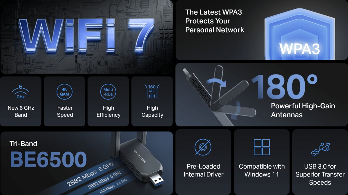 MA37BEH въоръжава вашия компютър с Wi-Fi 7 технология и 6 GHz лента , отключвайки пълния потенциал на вашия WiFi 7 рутер. Той безпроблемно се справя с всички ваши онлайн дейности, от стрийминг на HD видео до игри и сърфиране в интернет без забавяне, благодарение на високоскоростния си трибандов WiFi.