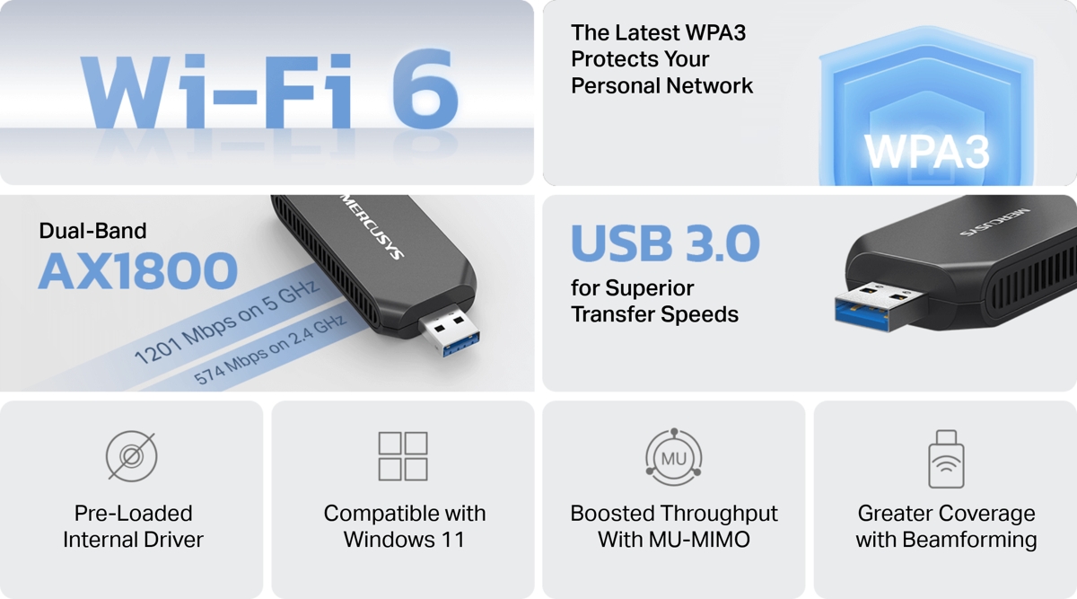 MERCUSYS MA70XM е безжичен USB 3.0 двубандов Wi-Fi 6 адаптер , който осигурява на вашия компютър бърза и стабилна Wi-Fi свързаност.