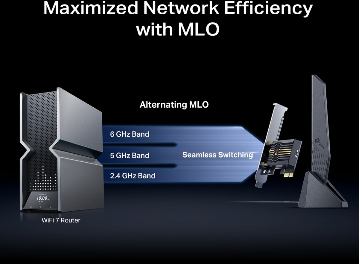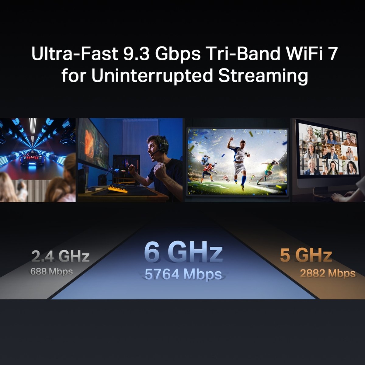 - Стандарт WiFi 7 — Разгърнете пълния потенциал на 6 GHz честотната лента, за да удвоите пропускателната способност на последното поколение