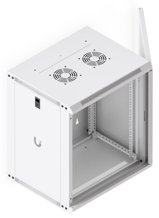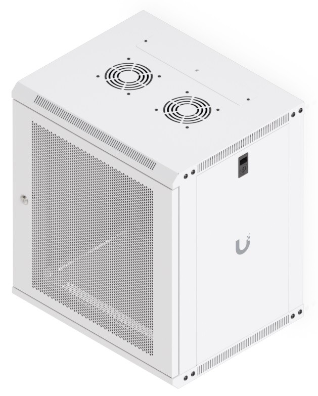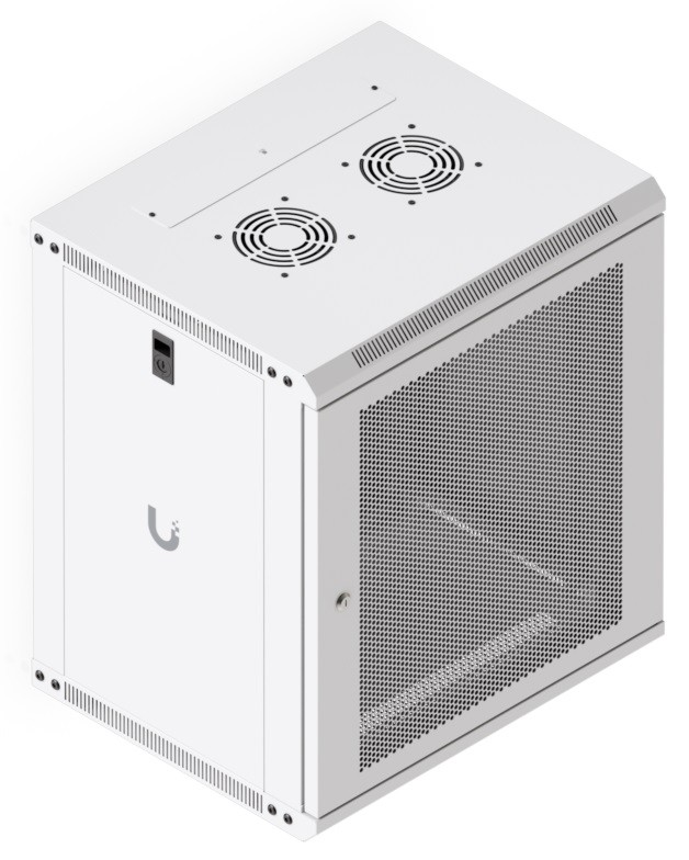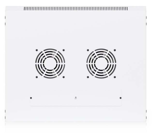 За да се осигури ефективно охлаждане на активните компоненти, шкафът за багажник е оборудван с чифт вентилатори, поддържащи общите нива на шум под 50 dB(A). Ако е необходимо да архивирате активни устройства, използвайки например батерии, ще оцените надстандартната му товароносимост от 50 кг. Корпусът е с елегантно бяло покритие с прахово боядисана повърхност, а логото на Ubiquiti е разположено на страничните панели. Точки за въвеждане на кабели, покрити с тапи, са налични от долната, горната и задната страна на шкафа за багажник.