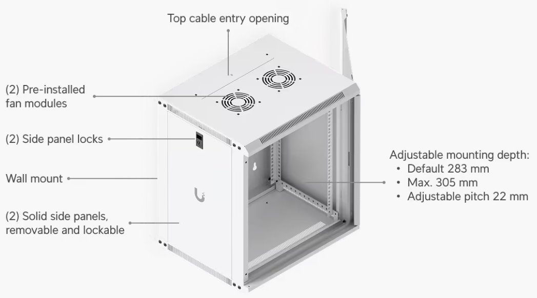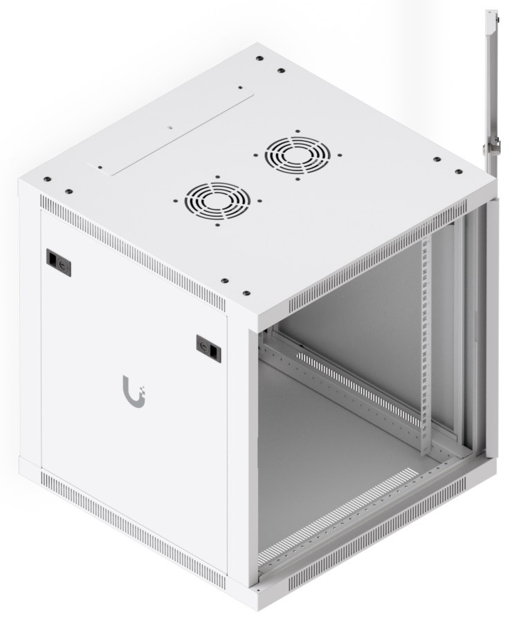 За да се осигури ефективно охлаждане на активните елементи, шкафът е оборудван с чифт вентилатори, общото ниво на шум е под 50dB(A). Ако е необходимо да се резервират активните елементи, например с батерии, със сигурност ще бъдете доволни от надстандартната товароносимост от 80 кг. Конструкцията е проектирана в елегантен бял цвят с прахово боядисана повърхност, като логото на Ubiquiti не липсва отстрани. Кабелни входове с тапи са подготвени отдолу, отгоре и отзад на шкафа.