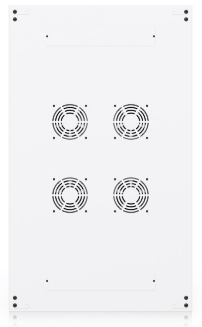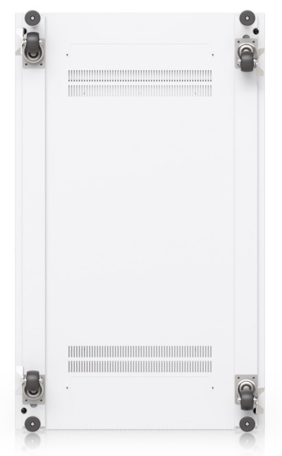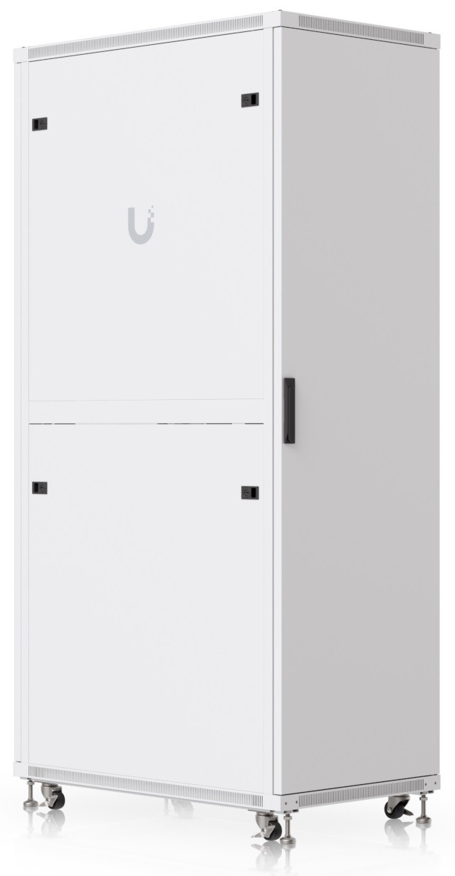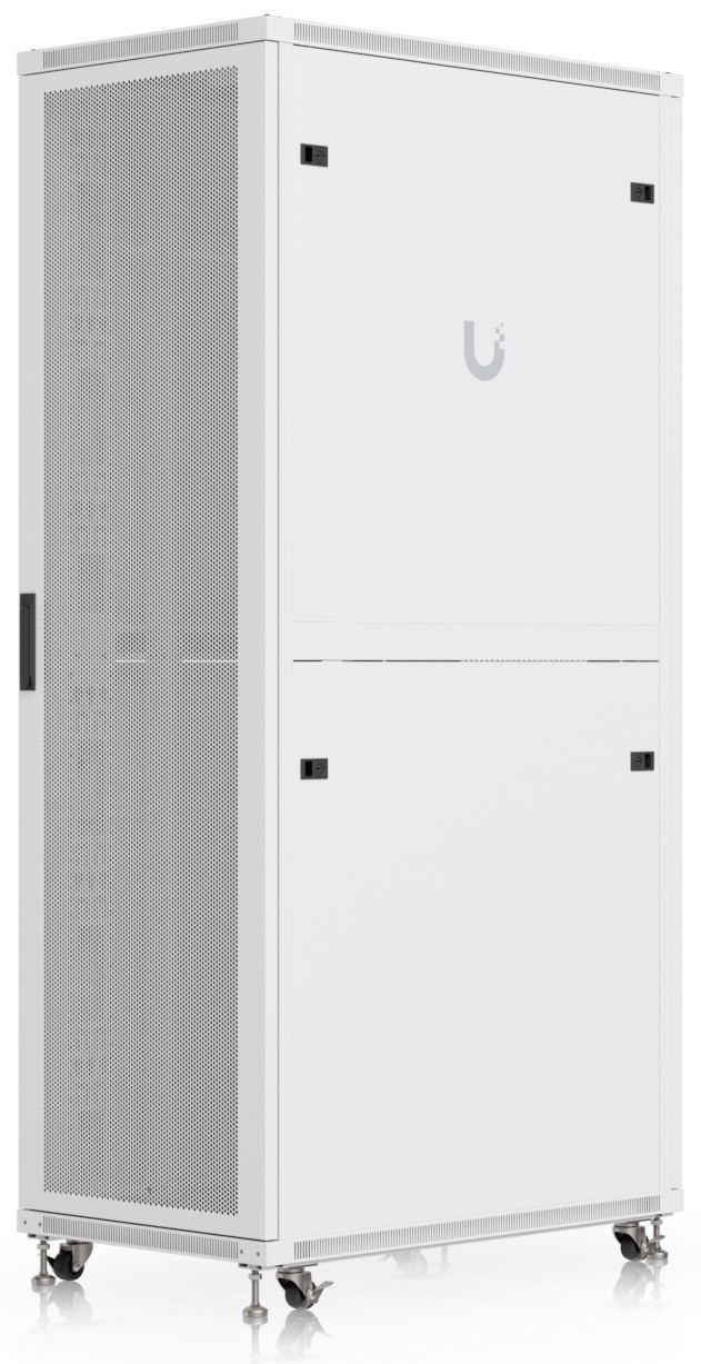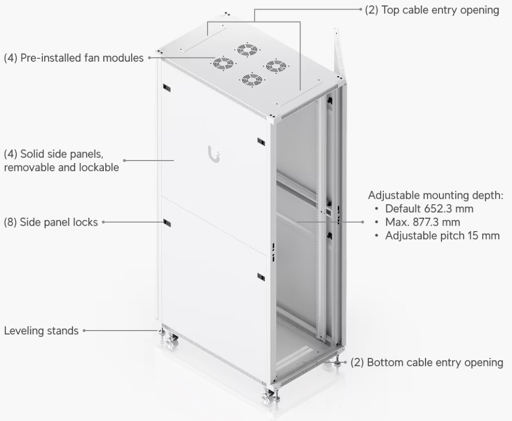 За да се осигури ефективно охлаждане на активните компоненти, шкафът е оборудван с четири вентилатора. Статичното натоварване е 800 кг, а товароносимостта при търкаляне е до 320 кг. Корпусът е с елегантно бяло покритие с прахово боядисана повърхност, а логото на Ubiquiti е разположено на страничните панели. Точки за кабелни входове, покрити с капаци, са налични от долната, горната и задната страна на шкафа.