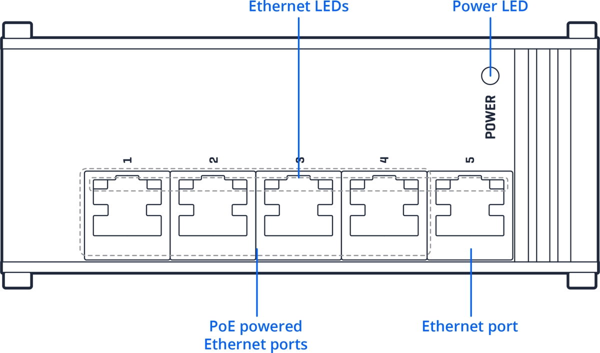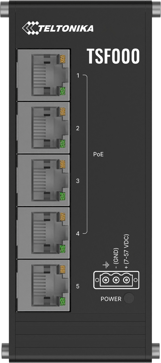 Това е автоматичен превод. Оригиналния текст може да видите тукThe Teltonika TSF000 is a low-profile unmanaged PoE switch with a switching capacity of 10Gbps and (5) 10/100Mbps ports (4x PoE-Out) designed for DIN rail mounting. Ports 1-4 support 802.3af/at PoE+ delivering up to 30W/port with a total budget of 120W. The switch is powered via a 7-57V DC terminal block and its power consumption is 1.5W (without PoE load).