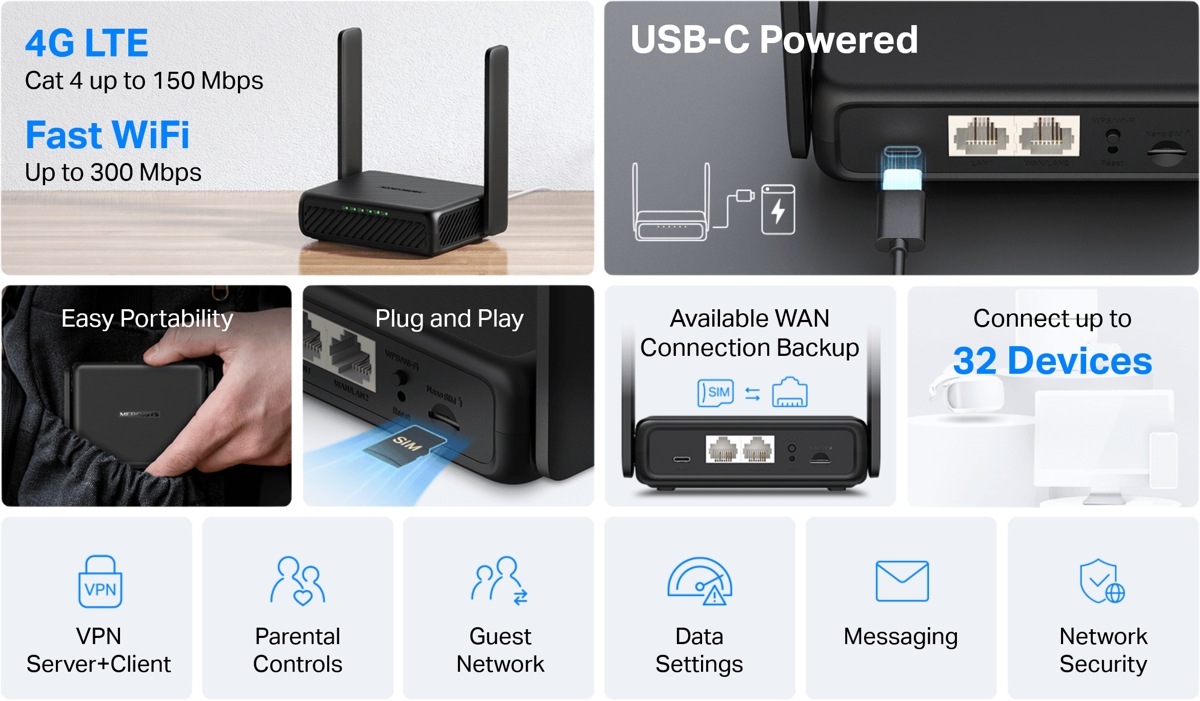 MERCUSYS MB113-4G, Wi-Fi 4 LTE travel router