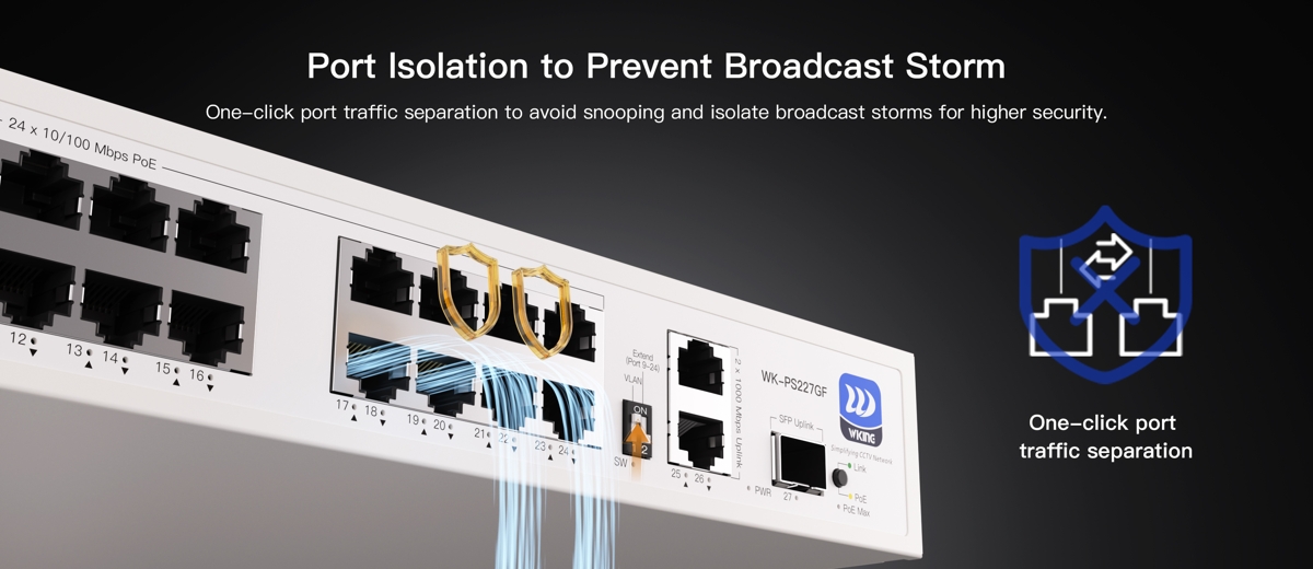Това е автоматичен превод. Оригиналния текст може да видите тукWiking WK-PS227GF е надежден неуправляем PoE L2 комутатор с комутационен капацитет от 10.8Gbps , (24) 10/100Mbps PoE порта , (2) 1Gbit uplink порта и (1) SFP uplink слот . Downlink портовете поддържат PoE с бюджет от 270W . Комутаторът е идеален за CCTV инсталации благодарение на PoE, автоматично рестартиране на IP камерата в случай на прекъсване на връзката и опцията за удължаване на разстоянието на предаване на PoE портовете до 250m . Комутаторът консумира 10W (без товар).