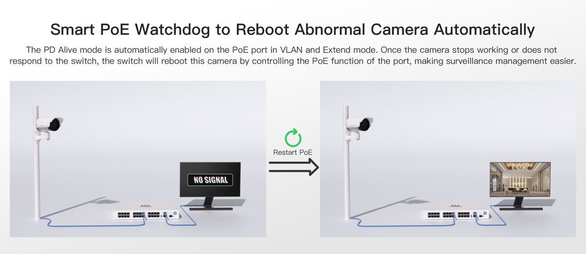 - VLAN - позволява изолиране на портове, при което всеки PoE порт може да предава данни само към uplink портовете, и функцията PD Alive, която автоматично рестартира изключени или неотзивчиви PoE устройства
