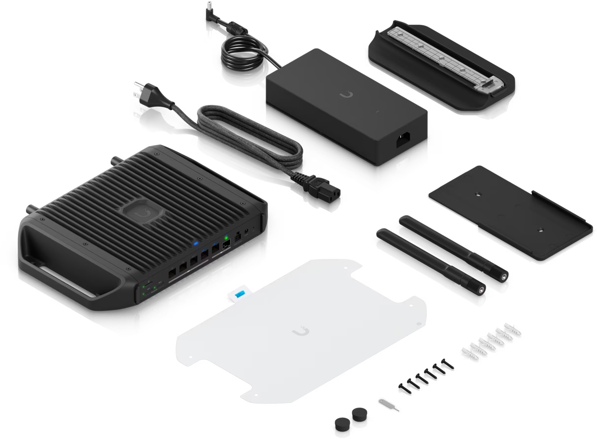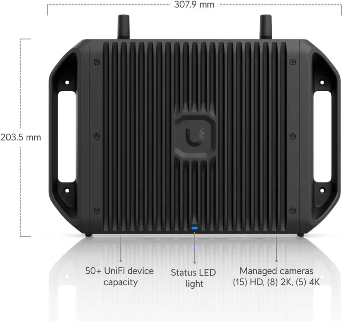 - Поддържа приложения UniFi Network, Protect, Access, Talk и Connect , управлявайки над 50 UniFi устройства и повече от 500 клиента