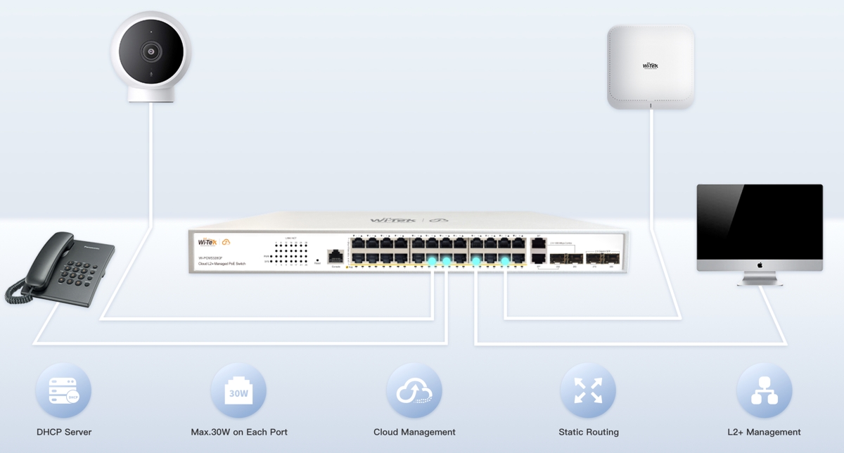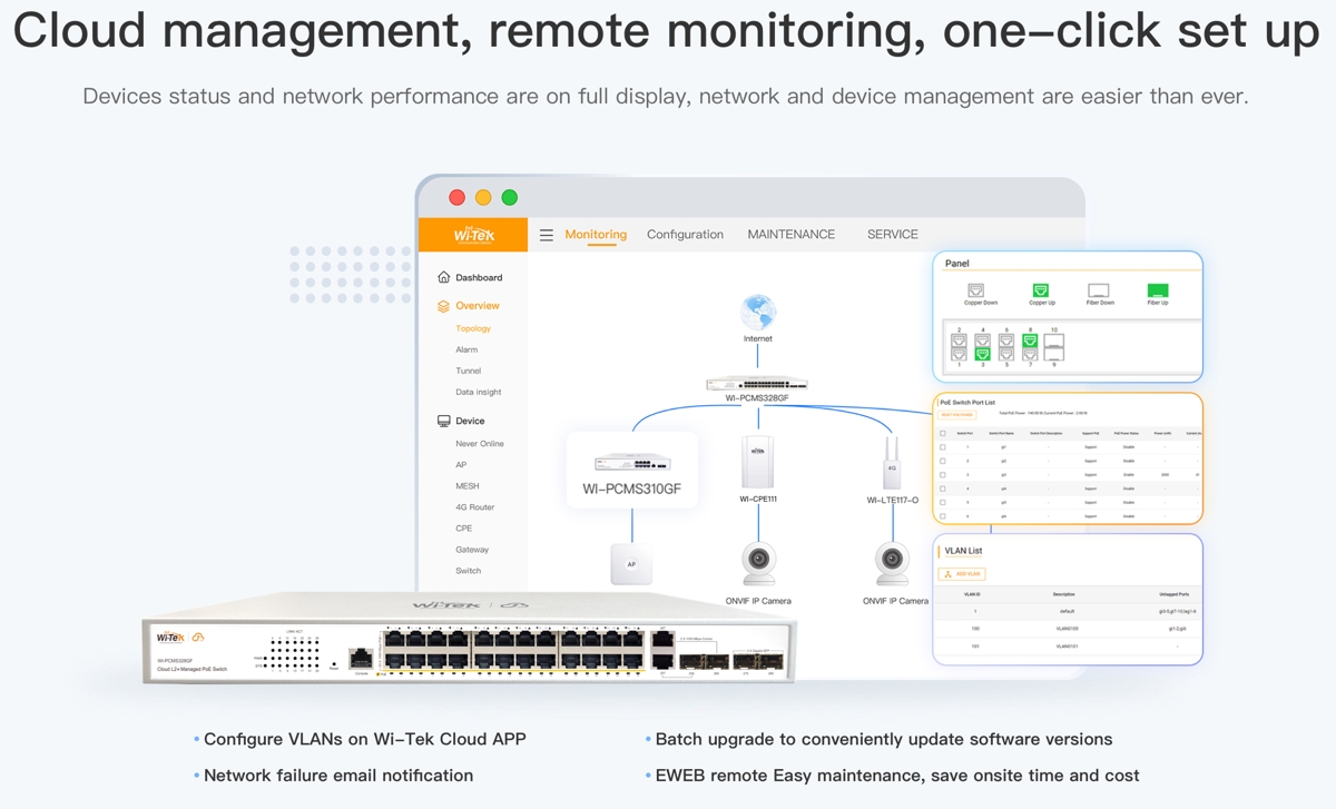 - Управление на облака чрез Wi-Tek Cloud - осигурява ефективно, лесно и сигурно дистанционно управление на устройства, интелигентно внедряване, автоматична мрежова конфигурация и предупреждения за необичайни събития