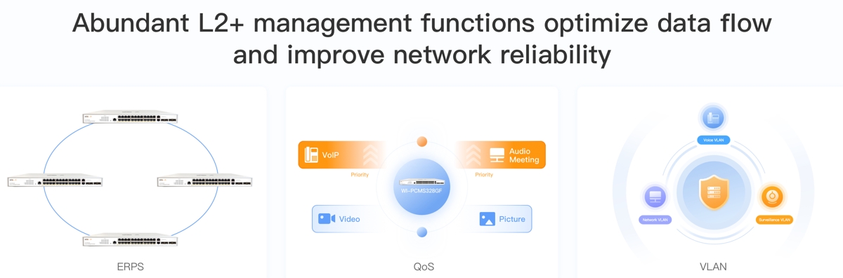 - Автоматично предотвратяване на цикли, VLAN, IGMP и DHCP snooping, QoS и агрегиране на връзки