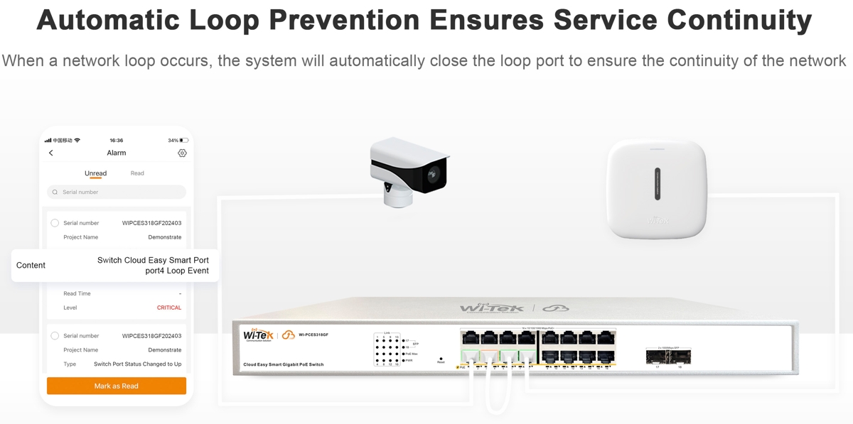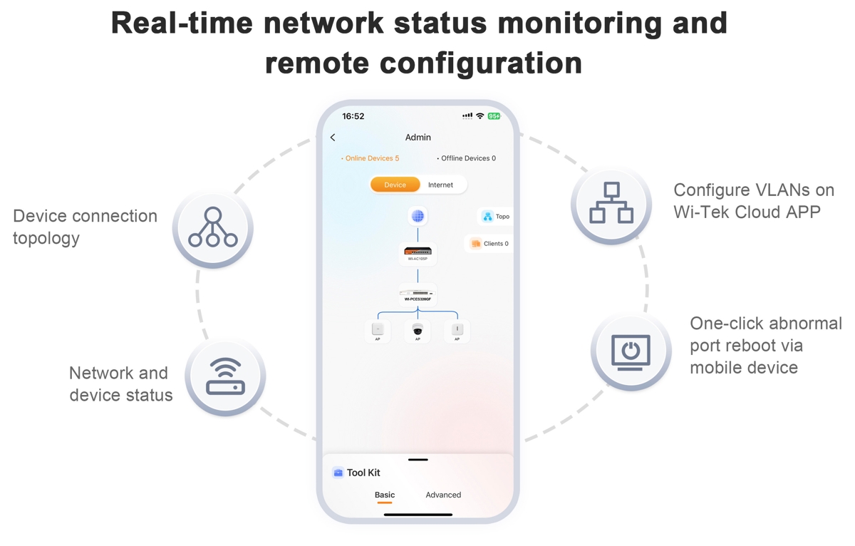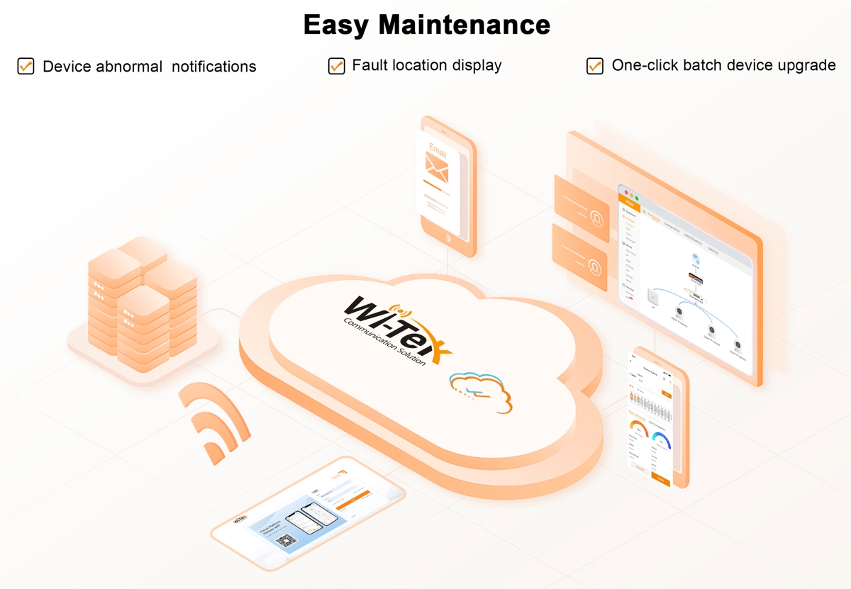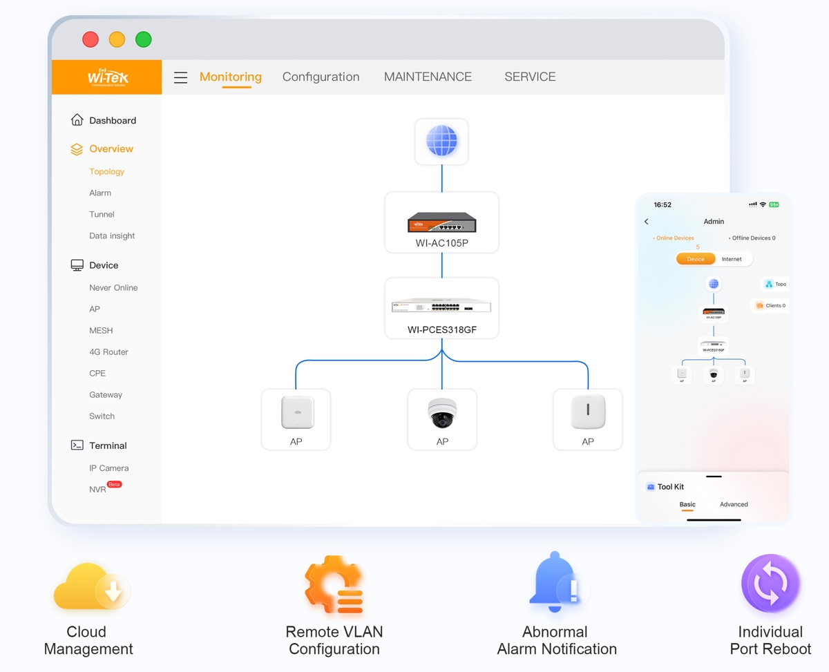 - Управление на облака чрез Wi-Tek Cloud - осигурява ефективно, лесно и сигурно дистанционно управление на устройства, интелигентно внедряване, автоматична мрежова конфигурация и предупреждения за необичайни събития