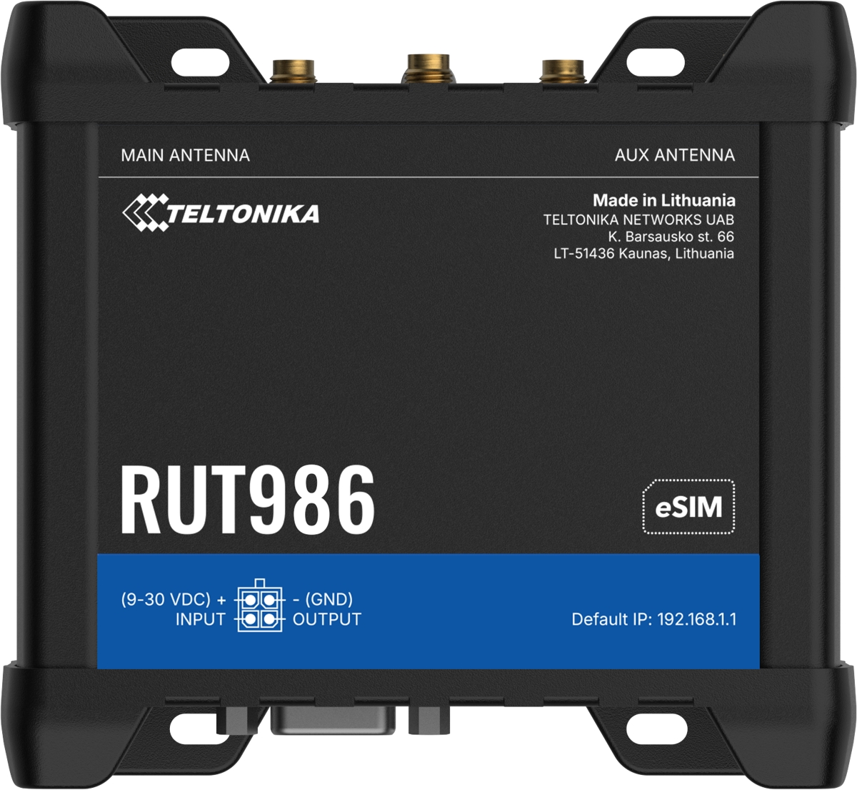 Teltonika RUT986 е индустриален 4G LTE Wi-Fi 4 рутер с WAN failover , (4) 10/100Mbps порта (3x LAN, 1x WAN), 2.4GHz 2x2 Wi-Fi 4, осигуряващ пропускателна способност до 300Mbps, (1) RS232 и (1) RS485 сериен интерфейс, (1) 10-пинов I/O терминален блок, (1) USB 2.0 порт, (3) SMA женски конектора за (2) външни LTE антени и (1) GNSS антена , (2) RP-SMA женски конектора за външни Wi-Fi антени, (2) mini SIM слота и поддръжка на eSIM .