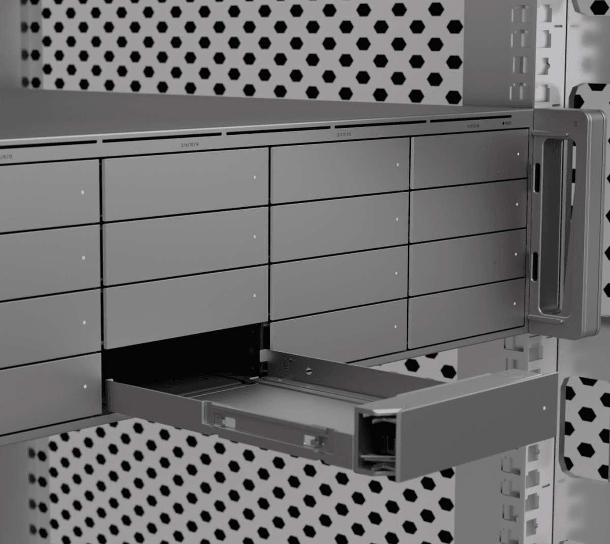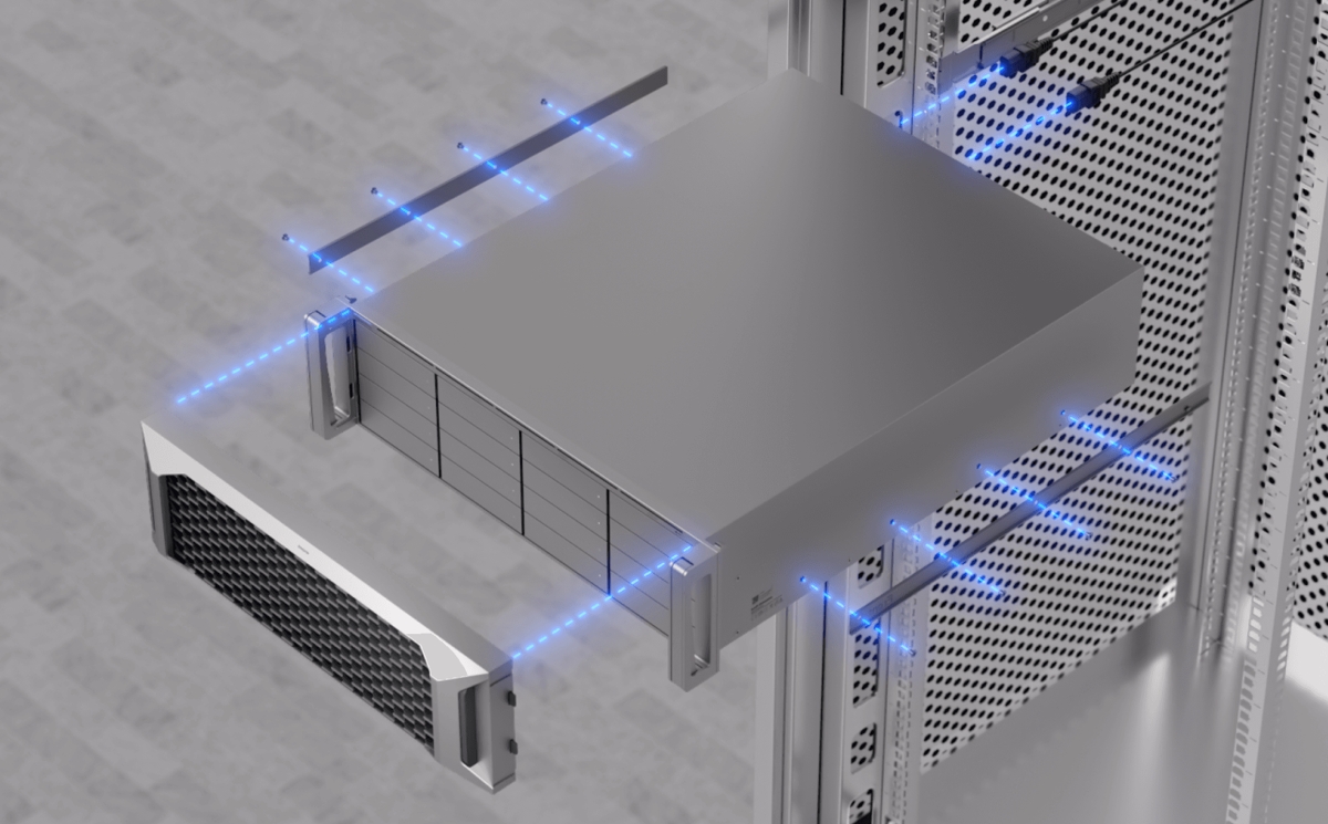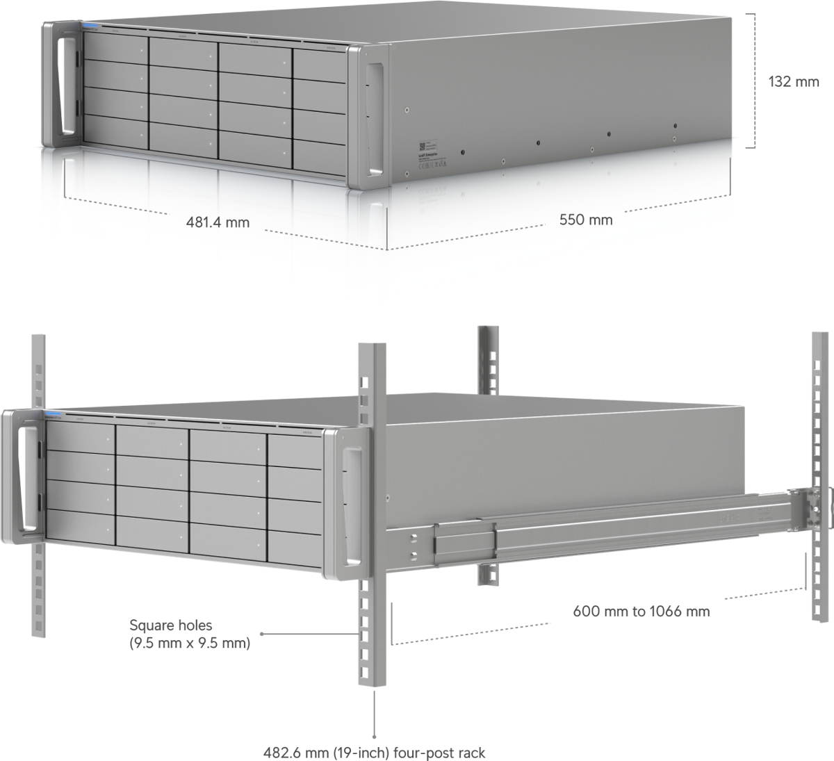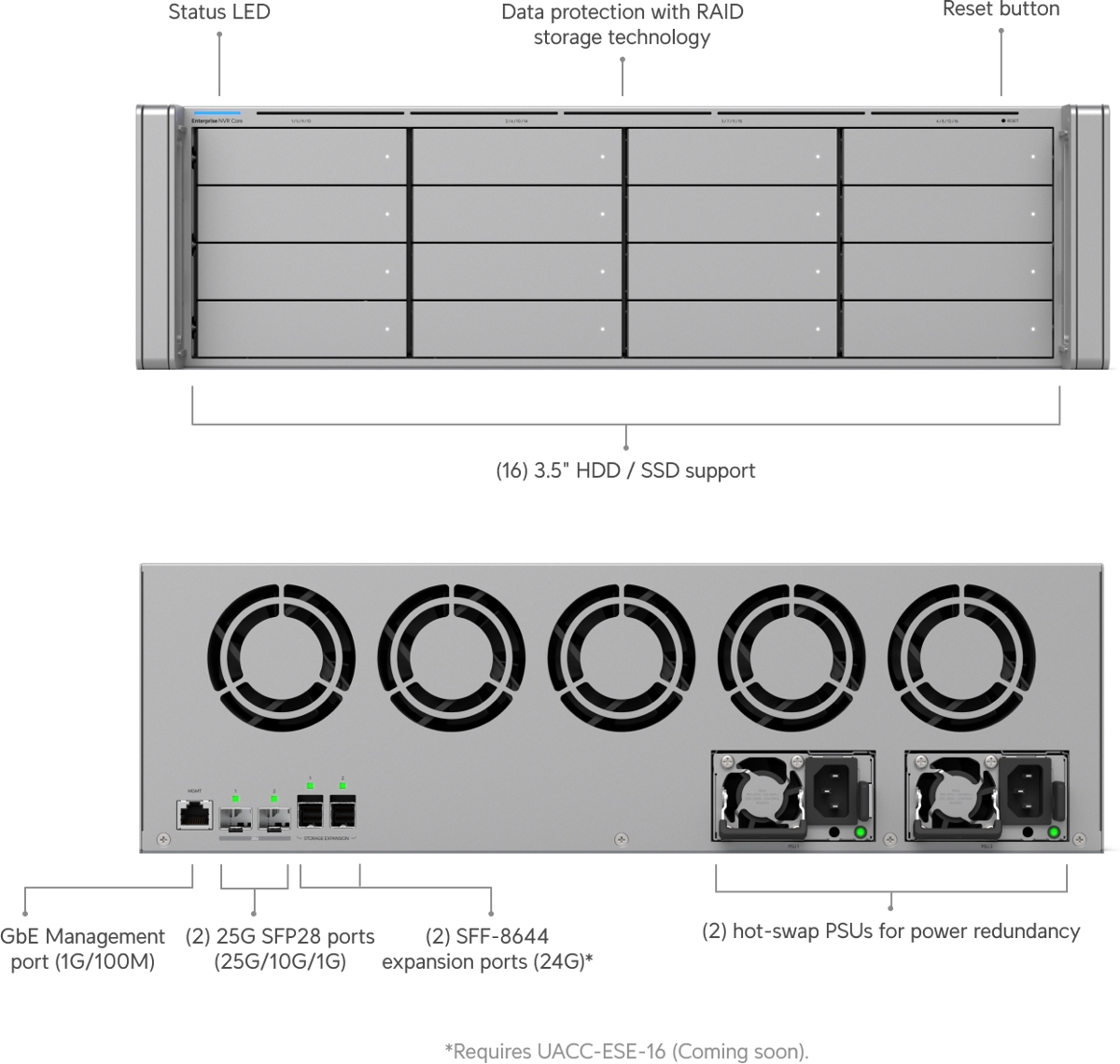 Мощният мрежов рекордер UniFi Protect Ubiquiti ENVR-Core, разполагащ с 3U шаси, (16) слота за 2.5"/3.5" HDD/SSD и опция за свързване на външна памет чрез (2) 24G SFP-8644 (Mini-SAS HD) порта, с поддръжка на RAID 5/6/10, ви позволява да свържете до 300 камери с 4K (8MP) резолюция , до 400 камери с 2K (4MP) или до 500 камери с FullHD (2MP) . Той е оборудван със 128-ядрен ARM процесор , 64GB RAM и чифт захранвания с възможност за гореща смяна, всяко с мощност 550W. За твърди дискове са предвидени до 313W. Мрежовата свързаност се осигурява от (2) 25G SFP28 слота и (1) 1Gbit порт за управление.