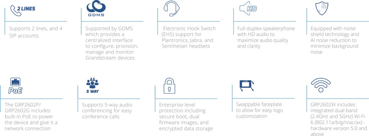 The GRP2602 features 5-way voice conferencing to maximize productivity, integrated PoE (GRP2602P/GRP2602G), Wi-Fi support (GRP2602W), and is supported by Grandstream’s Device Management System (GDMS).