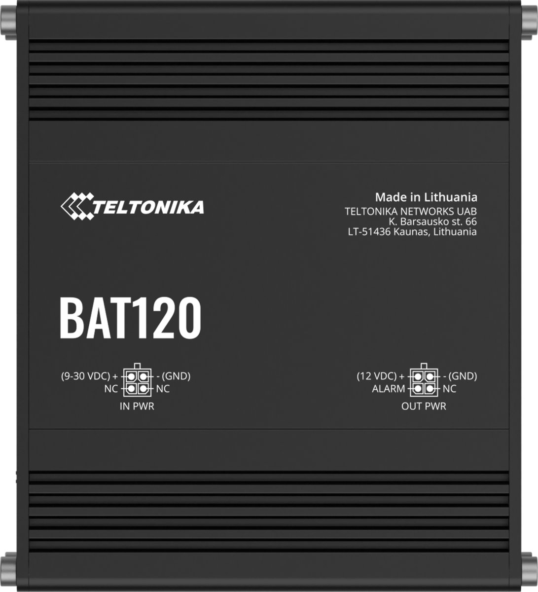 Teltonika Bat120 is a small UPS that only works with DC voltage and hides a small 2600 mAh battery (17 Wh) for bridging short outages for Teltonika Facility with 4-pin connector. On the one hand, the input and output 4-pin DC connector with a voltage of 9 to 30 V DC with a maximum current of 1.8 A (22 W)