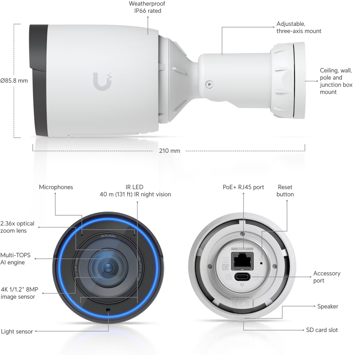 Ubiquiti G6 Pro Bullet features an 8MP sensor (3840 x 2160px) at 30 fps, a varifocal lens (2.36x optical zoom), and adaptive IR illumination for night vision up to 40 meters. The camera has a durable housing made of aluminum and polycarbonate, with IP66 protection against dust and powerful water jets. It connects to the network via Gigabit LAN with PoE support (37 to 57V DC) and a maximum power consumption of 15W.