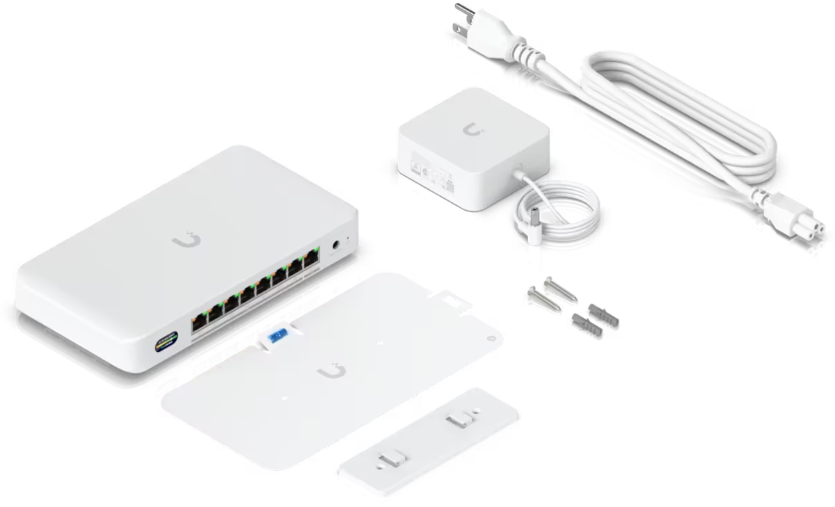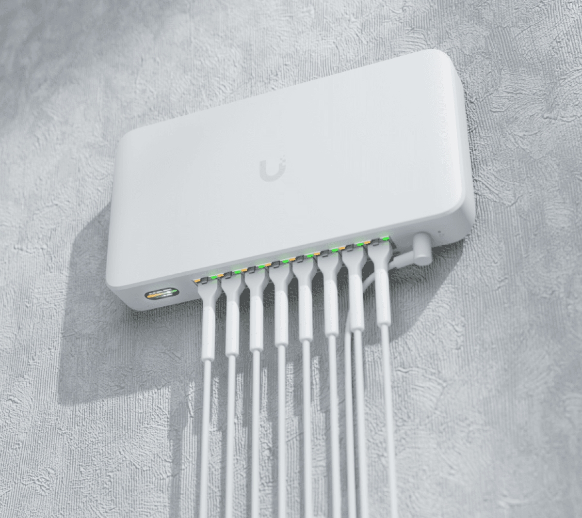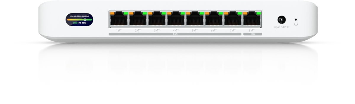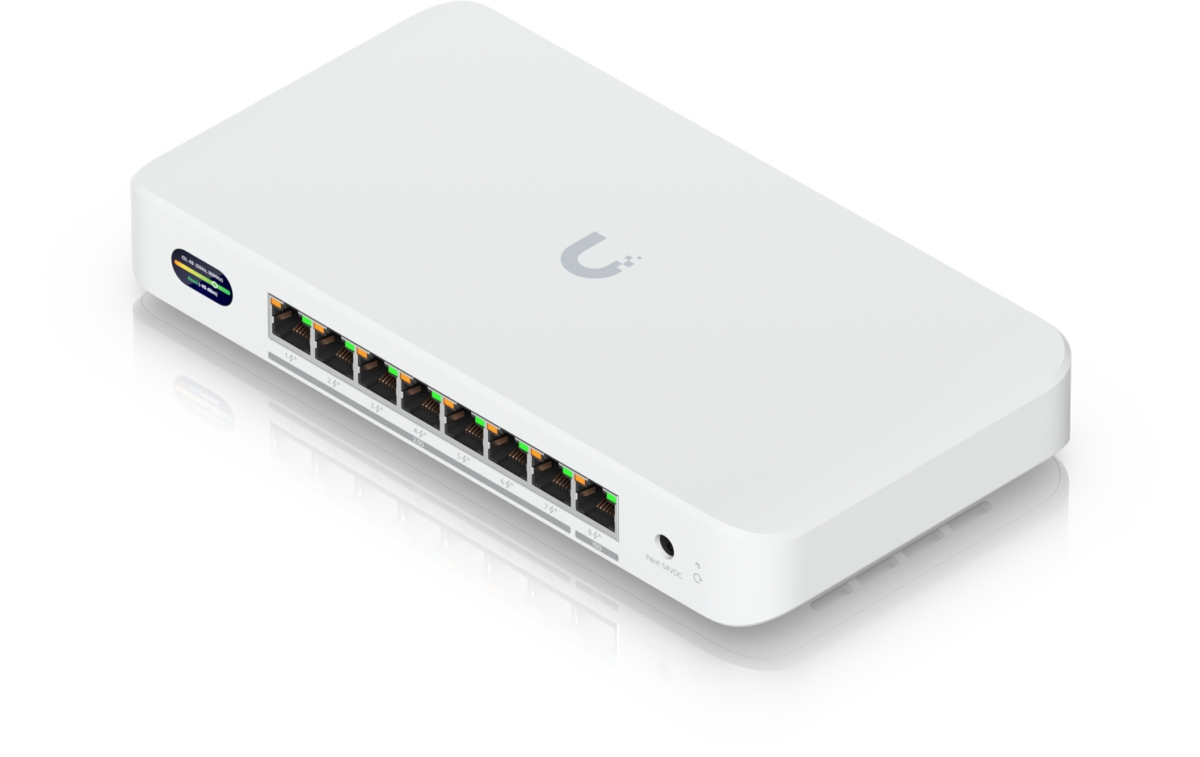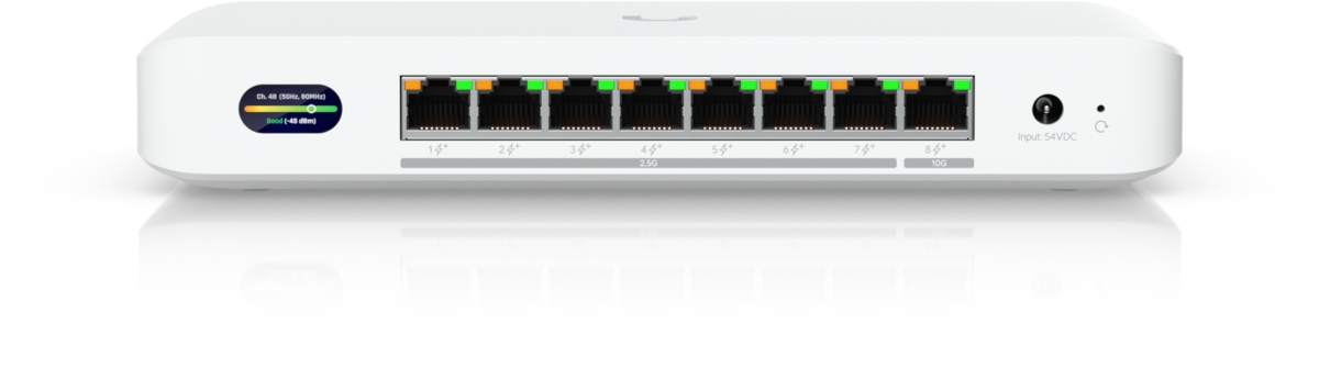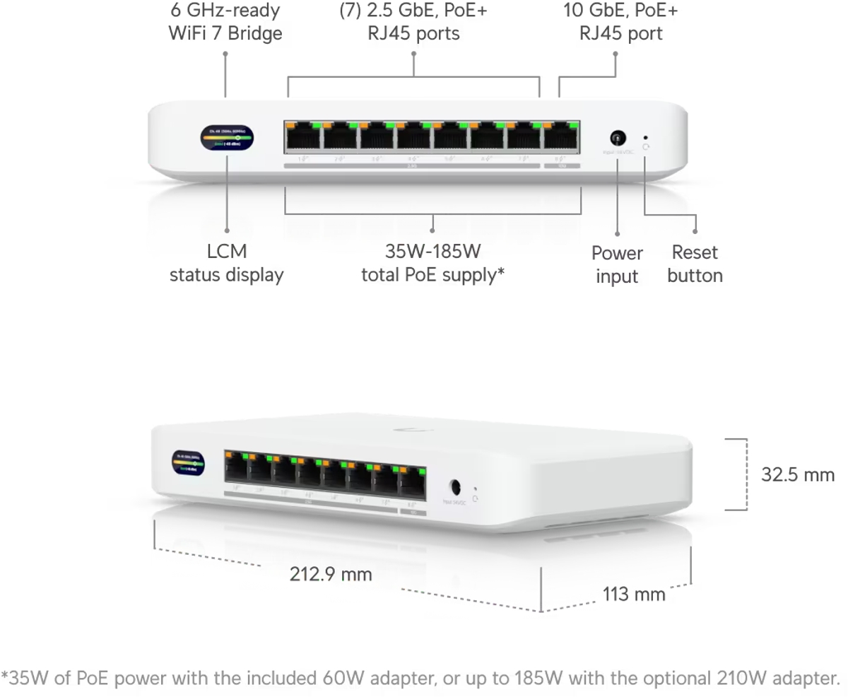 Ubiquiti Device Bridge Switch is a 2.5Gbit UniFi PoE switch with support for wireless Wi-Fi 7 uplink, (1) 10Gbit PoE+ port, (7) 2.5Gbit PoE+ ports and a PoE budget of up to 185W*. The maximum power consumption of the device is 25W (without PoE load).