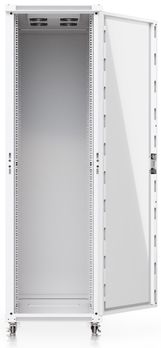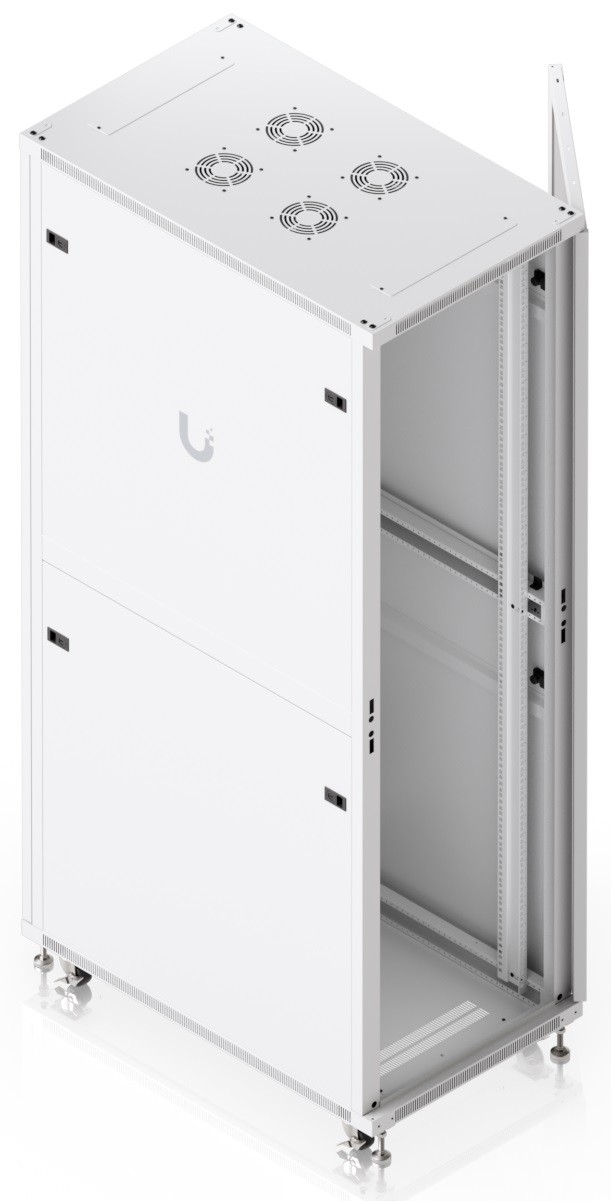To ensure efficient cooling of active components, the rack is equipped with four fans. The static load capacity is 800 kg, and the rolling load capacity is up to 320 kg. The enclosure features an elegant white finish with a powder-coated surface, and the Ubiquiti logo is present on the side panels. Cable entry points covered with blanking plates are available on the bottom, top, and rear sides of the rack.