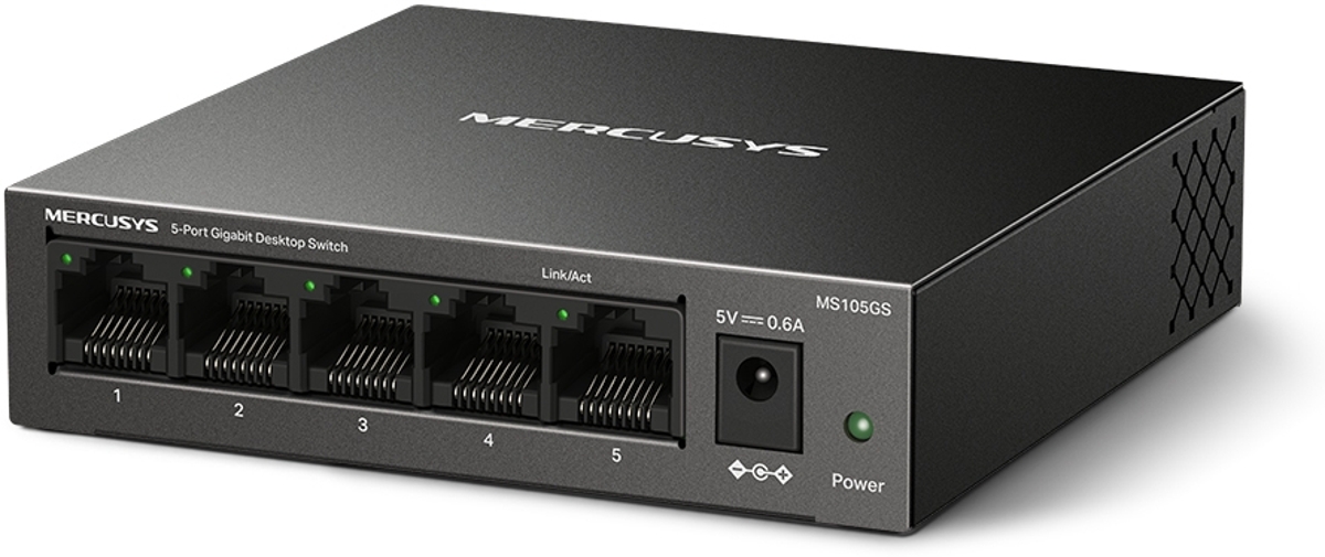 MERCUSYS MS105GS is an unmanaged switch with a switching capacity of 10Gbps and (5) 1Gbit ports. The switch uses passive cooling, providing completely silent operation suitable for office environments. It is powered via a 5V/0.6A DC connector and its maximum power consumption is 3.6W.