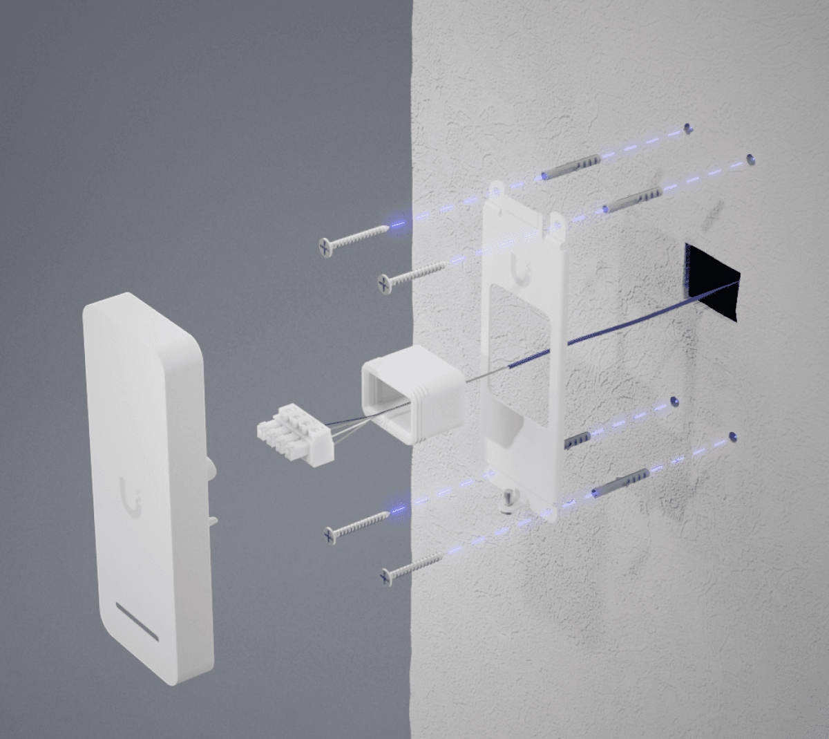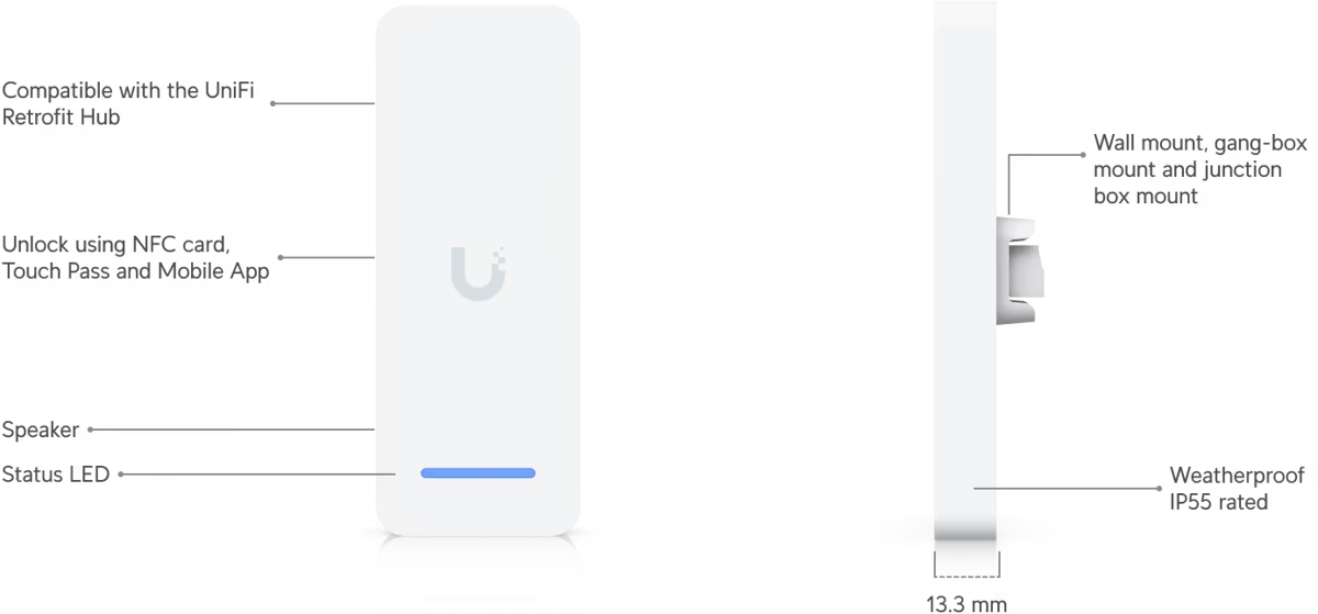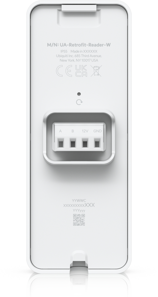 The Ubiquiti UniFi Access UA-Retrofit-Reader-W is a contactless NFC card reader designed for use with the UA-Retrofit-Hub-2, with support for daisy-chaining up to 2 readers per door. It communicates with the hub using the secure OSDP v2 protocol over the RS-485 interface.