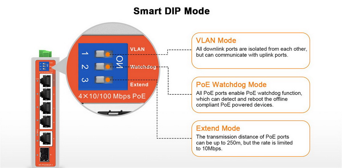 The DIP switch on the front panel allows you to select operating modes according to the needs of your network: