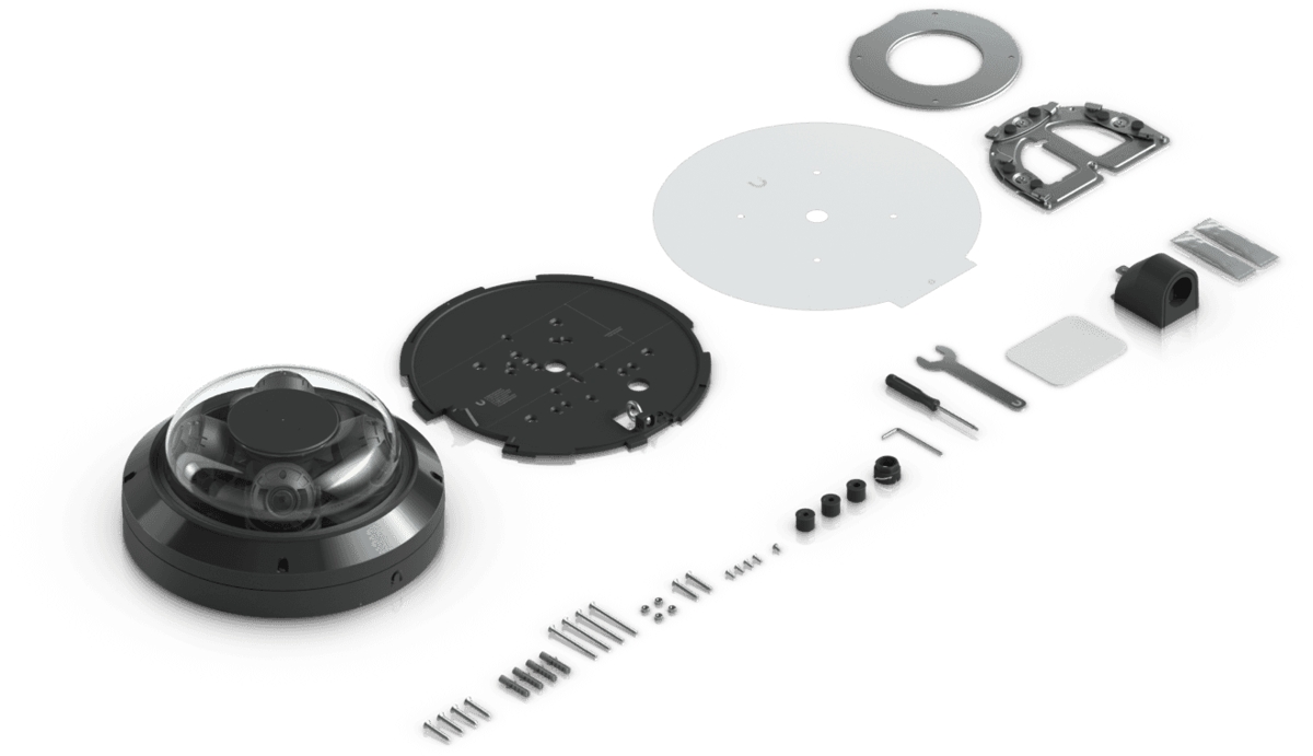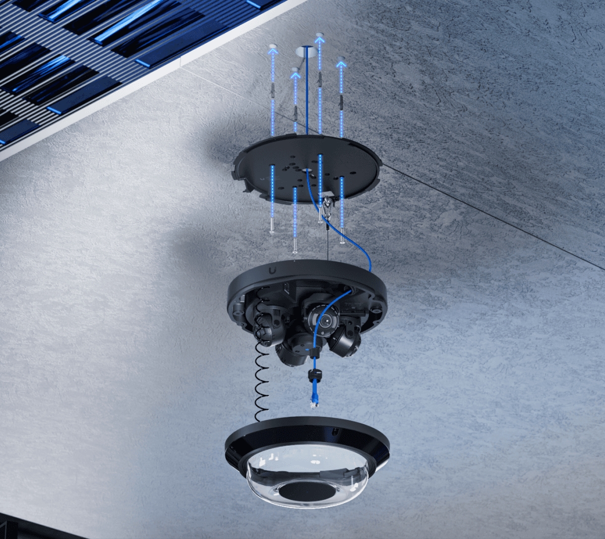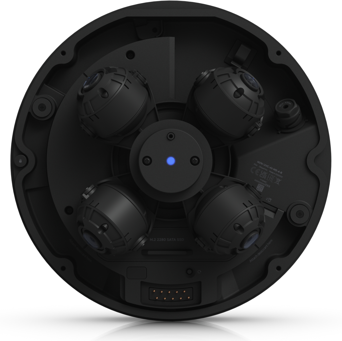 The Ubiquiti UniFi Protect IP panoramic hybrid camera UVC-AI-MS-4-B is equipped with (4) independently adjustable 8MP sensors (each 3840 x 2160 px) at 30fps, providing a total field of view up to 360°, adaptive IR illumination for night vision up to 20m and IP66 and IK10 protection ratings. The camera can be connected to the network via 1Gbit LAN and supports PoE++, with a maximum power consumption of 34.6W.