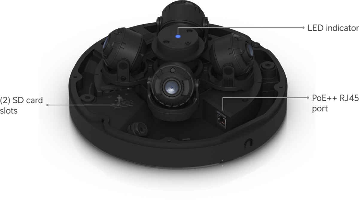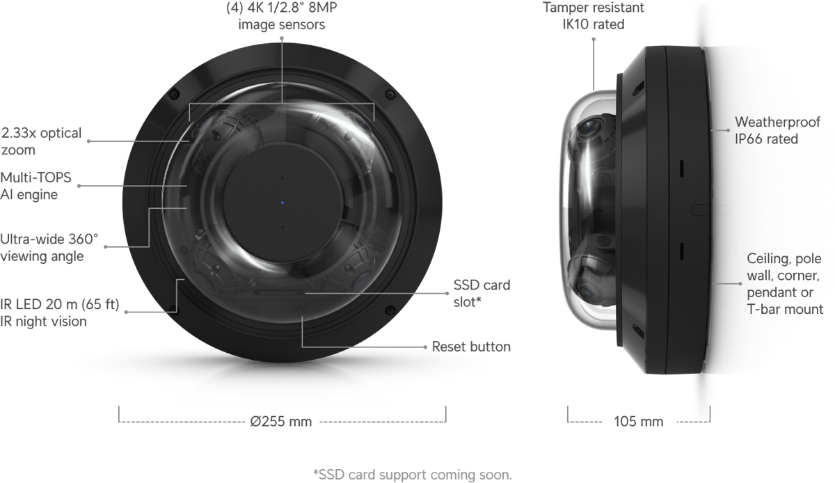 - (4) 8MP 30fps sensors (3840 x 2160 px), up to 360° coverage (adjustable field of view per sensor from 42.8° to 108.8°)