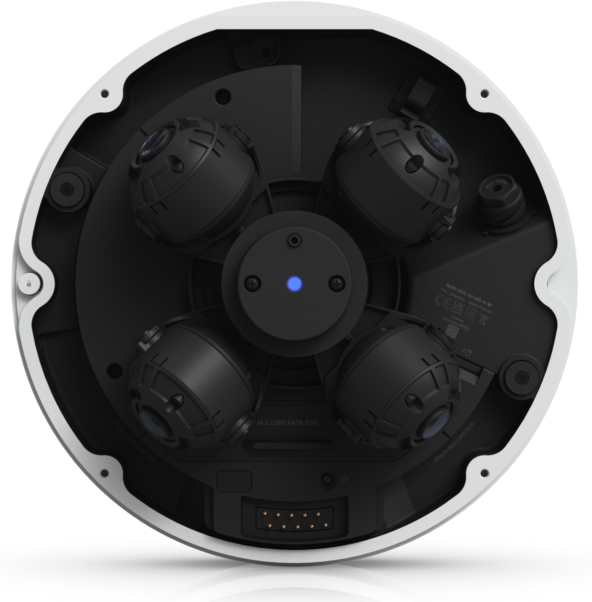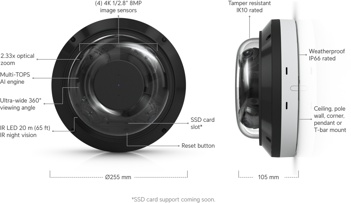 - (4) 8MP 30fps sensors (3840 x 2160 px), up to 360° coverage (adjustable field of view per sensor from 42.8° to 108.8°)