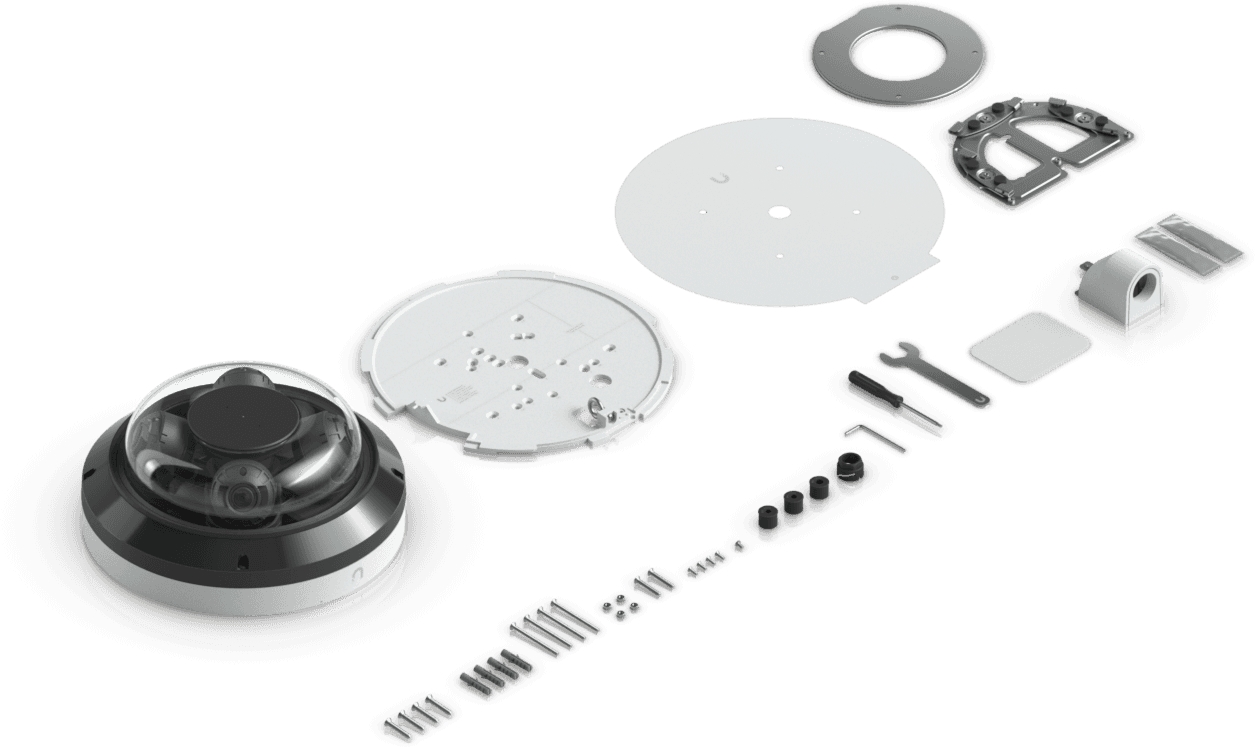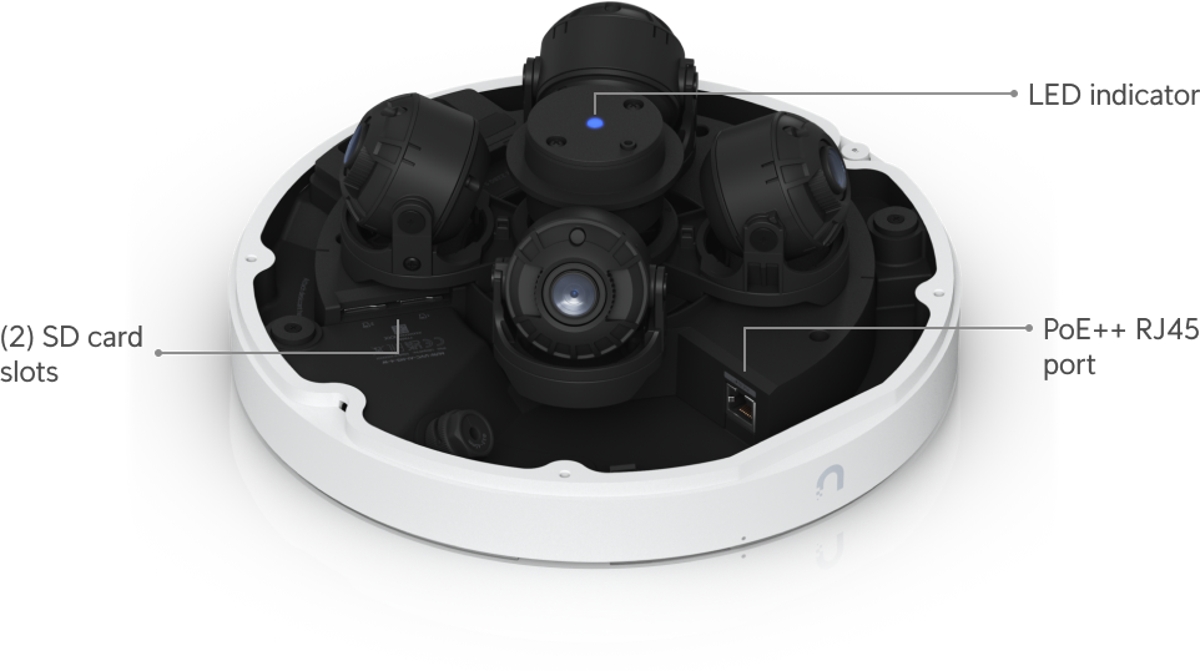 The Ubiquiti UniFi Protect IP panoramic hybrid camera UVC-AI-MS-4-W is equipped with (4) independently adjustable 8MP sensors (each 3840 x 2160 px) at 30fps, providing a total field of view up to 360°, adaptive IR illumination for night vision up to 20m and IP66 and IK10 protection ratings. The camera can be connected to the network via 1Gbit LAN and supports PoE++, with a maximum power consumption of 34.6W.