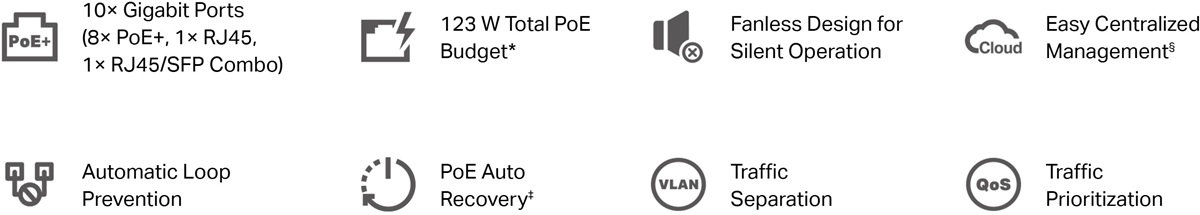 - 123 W PoE бюджет, 8× 802.3at/af PoE (до 250 м при 10 Mb/s)
