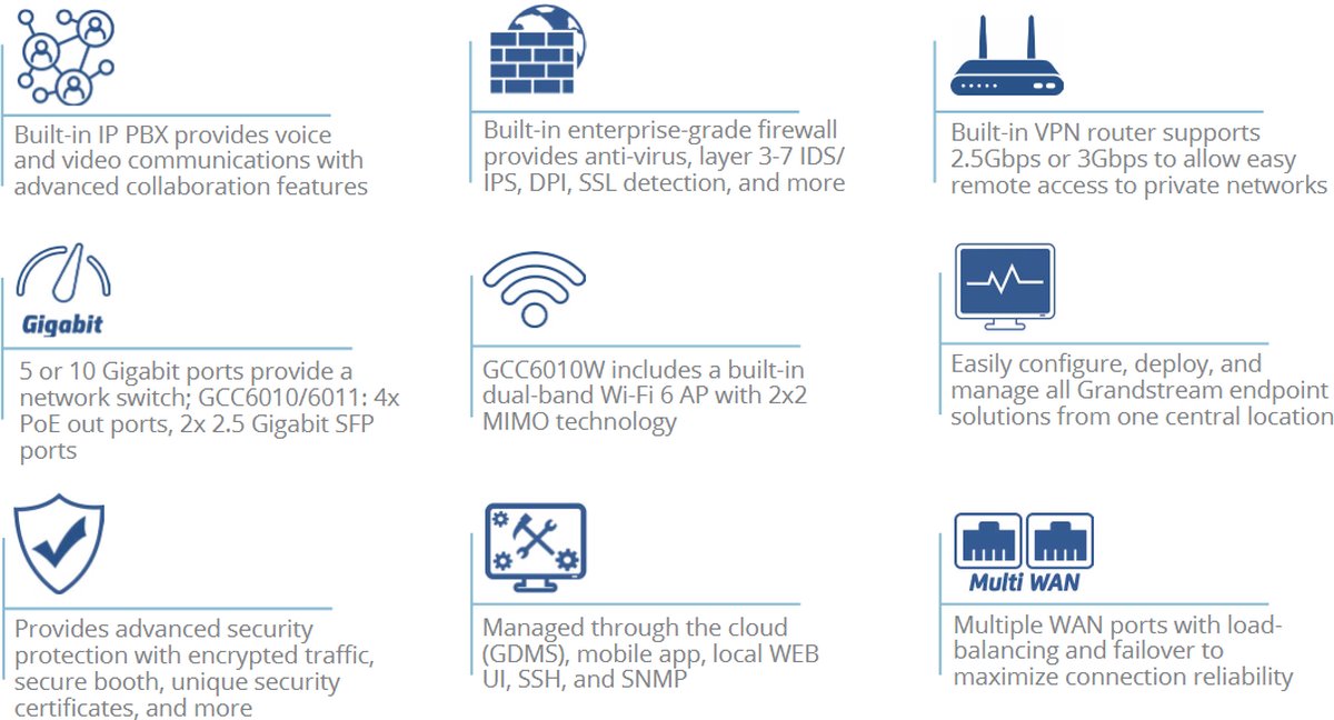 Това е автоматичен превод. Оригиналния текст може да видите тукСерията GCC6000 предоставя изключително решение „всичко в едно“, което обединява решения за унифицирани комуникации и мрежи в една платформа. Тези авангардни устройства комбинират функционалността на 4 продукта, за да осигурят решение „всичко в едно“, което включва VPN рутер, защитна стена от следващо поколение, IP PBX и мрежов комутатор или Wi-Fi точка за достъп. Серията включва три модела: GCC6010, GCC6010W и GCC6011.