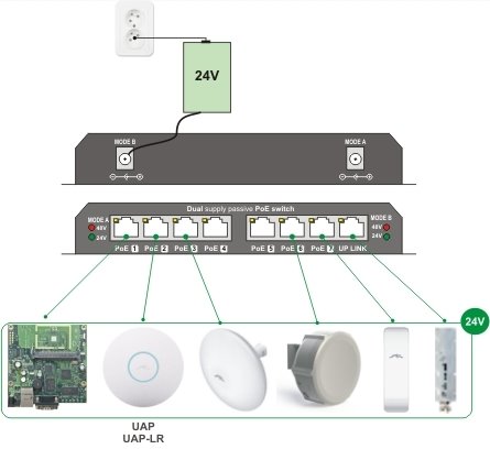 Режим B - с помощта на 24V захранващ адаптер - подходящ за захранване на устройства, очакващи захранване на пинове 4, 5 (+), 7, 8 (-) , например Ubiquity NanoBeam, NSM5, PowerBeam, MikroTik SXT, LHG и др.