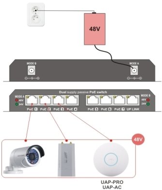 Режим A - използвайки 48V захранващ адаптер - подходящ за захранване на устройства, очакващи захранване на пинове 1, 2, (+), 7, 8 (-) , например IP камери, VoIP шлюзове, UAP-AC-PRO, UAP-AC- LR, UAP-AC-Lite и др.