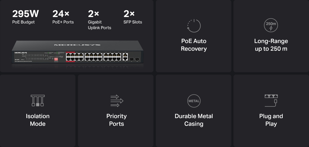 - Портове 1–24 поддържат PoE+ 802.3af/at с изходна мощност до 30W/порт и общ бюджет от 295W
